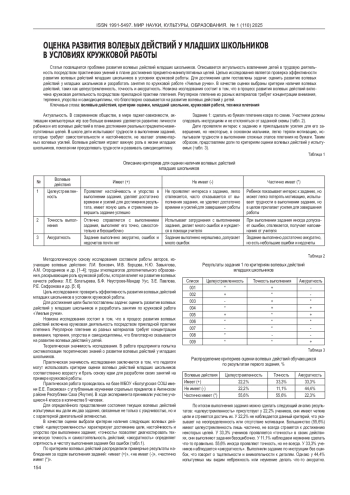 Статья посвящается проблеме развития волевых действий младших школьников. Описывается актуальность вовлечения детей в трудовую деятельность посредством практических умений в плане достижения предметно-манипулятивных целей. Целью исследования является проверка эффективности развития волевых действий младших школьников в условиях кружковой работы. Для достижения цели поставлены задачи: оценить развитие волевых действий у младших школьников и разработать занятия по кружковой работе «Умелые ручки». В качестве оценки выбраны критерии наличия волевых действий, таких как целеустремленность, точность и аккуратность. Новизна исследования состоит в том, что в процесс развития волевых действий включена кружковая деятельность посредством прикладной практики плетения. Регулярное плетение из разных материалов требует концентрации внимания, терпения, упорства и самодисциплины, что благотворно сказывается на развитие волевых действий у детей.