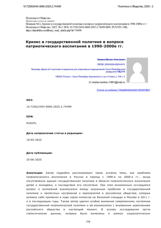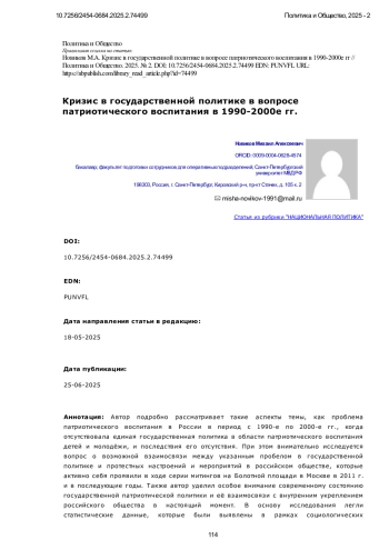 Автор подробно рассматривает такие аспекты темы, как проблема патриотического воспитания в России в период с 1990-е по 2000-е гг., когда отсутствовала единая государственная политика в области патриотического воспитания детей и молодёжи, и последствия его отсутствия. При этом внимательно исследуется вопрос о возможной взаимосвязи между указанным пробелом в государственной политике и протестных настроений и мероприятий в российском обществе, которые активно себя проявили в ходе серии митингов на Болотной площади в Москве в 2011 г. и в последующие годы. Также автор уделил особое внимание современному состоянию государственной патриотической политики и её взаимосвязи с внутренним укреплением российского общества в настоящий момент. В основу исследования легли статистические данные, которые были выявлены в рамках социологических исследований, о демографических показателях лиц, участвовавших в протестных движениях, а также относящих себя к патриотам, а также сравнительный анализ данных. Новизной проведённого исследования является выведение закономерности между отсутствием единой государственной политики в области патриотизма в период между 1990-ми и 2000-ми гг. и ряда событий в виде серии митингов, начиная с Болотной площади, заканчивая митингами, направленными против проведения специальной военной операции. Так же в качестве вывода автор отметил, что для устойчивого развития государства необходимо проведение патриотической политики, которая консолидирует общество и делает его более устойчивым от внешних и внутренних деструктивных идей и движений. Современная политика патриотического воспитания явно даёт свои положительные результаты, она обусловлена закономерностями развития общества. Эти результаты наглядны прослеживаются в увеличении количества лиц, которые причисляют себя к патриотам страны, а также увеличении числа волонтёров, которые готовы оказать реальную поддержку и помощь без какого-либо вознаграждения. Тем не менее актуальным видится придание системности этой работе на всех уровнях власти.