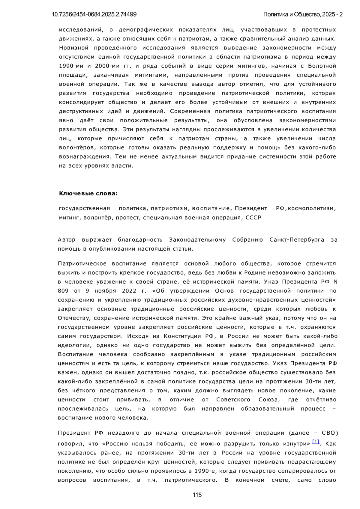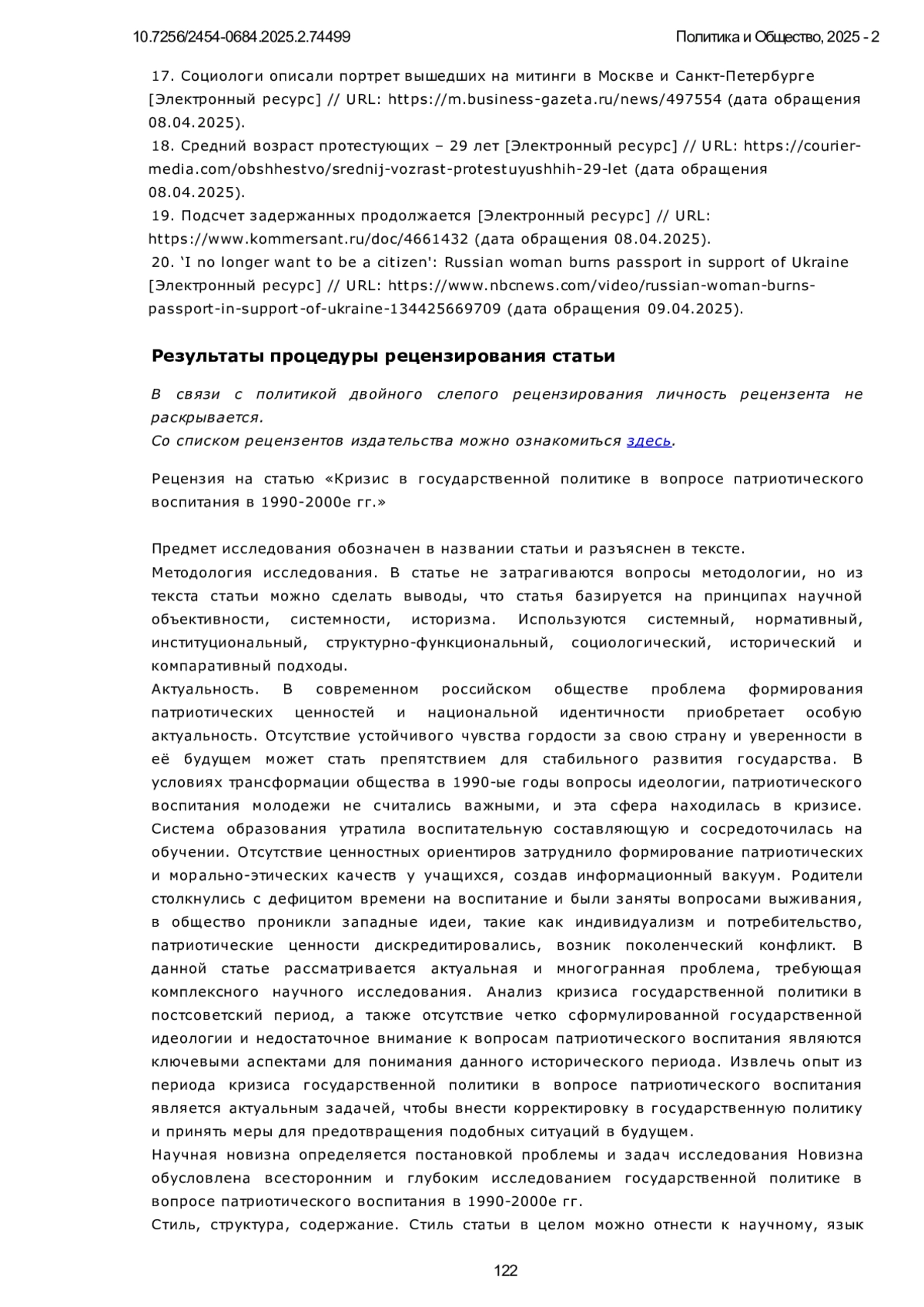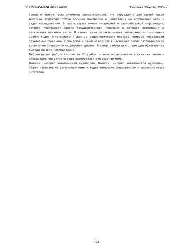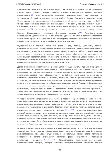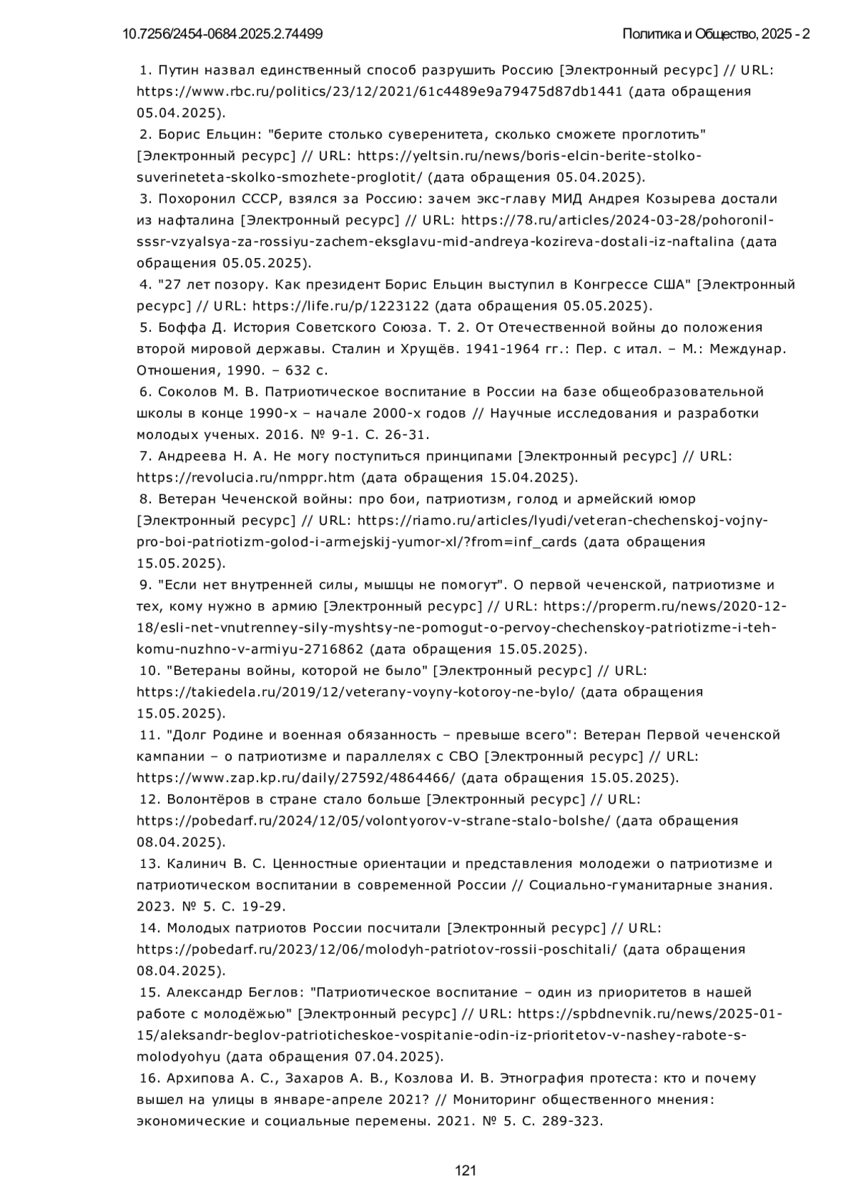 13. Калинич В. С. Ценностные ориентации и представления молодежи о патриотизме и патриотическом воспитании в современной России // Социально-гуманитарные знания. 2023. № 5. С. 19-29.