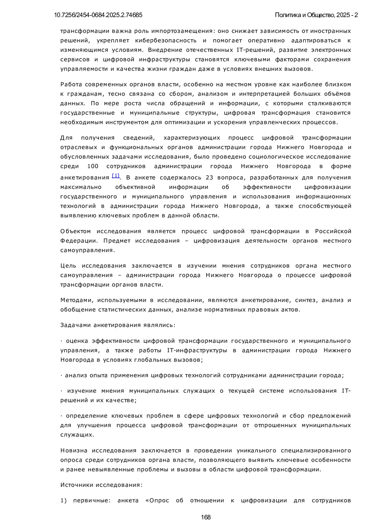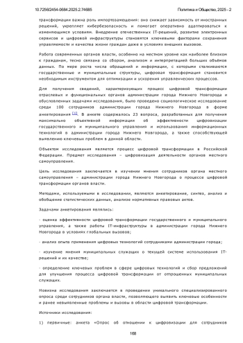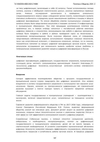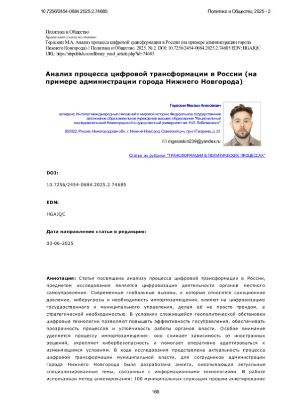 Статья посвящена анализу процесса цифровой трансформации в России, предметом исследования является цифровизация деятельности органов местного самоуправления. Современные глобальные вызовы, к которым относятся санкционное давление, киберугрозы и необходимость импортозамещения, влияют на цифровизацию государственного и муниципального управления, делая её не просто трендом, а стратегической необходимостью. В условиях сложившейся геополитической обстановки цифровые технологии позволяют повышать эффективность госуправления, обеспечивать прозрачность процессов и устойчивость работы органов власти. Особое внимание уделяется процессу импортозамещения: оно снижает зависимость от иностранных решений, укрепляет кибербезопасность и помогает оперативно адаптироваться к изменяющимся условиям. В ходе исследования представлена актуальность процесса цифровой трансформации муниципальной власти, для сотрудников администрации города Нижнего Новгорода была разработана анкета, охватывающая актуальные специализированные темы, связанные с информационными технологиями. В работе использован метод анкетирования: 100 муниципальных служащих прошли анкетирование на тему цифровизации, включавшее в себя 23 вопроса. Также использовались методы синтеза, анализа и обобщения статистических данных, анализа нормативных правовых актов. Новизна исследования заключается в проведении уникального специализированного опроса среди сотрудников органа власти, позволяющего выявить ключевые особенности и определить ранее невыявленные проблемы и вызовы в области цифровой трансформации. По итогам обработки ответов муниципальных служащих на вопросы анкеты были представлены результаты о хорошем состоянии IT-инфраструктуры в муниципальном образовании. При этом прошедшие анкетирование отметили ряд проблемных зон, в первую очередь связанных с нестабильной работой некоторых цифровых сервисов и сложностями, возникающими при работе в офисных программах, которые были внедрены в работу в рамках проведения курса на техническое и программное импортозамещение. Была получена обратная связь от сотрудников, представивших собственное видение использования передовых сквозных технологий, таких как искусственный интеллект, и предложили изменения, которые, по их мнению, положительно повлияют на процесс цифровой трансформации органов власти. Анализ результатов исследования дал возможность выявить наиболее острые проблемы и потенциальные направления развития процесса цифровой трансформации в России.