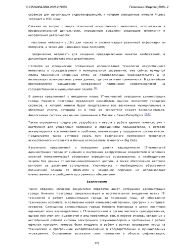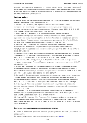 10. Гатауллин, А.Р. Искусственный интеллект в государственном управлении // Международный журнал гуманитарных и естественных наук. 2024. № 3-2 (90). С. 22-27. DOI: 10.24412/2500-1000-2024-3-2-22-27 EDN: CAIHAJ