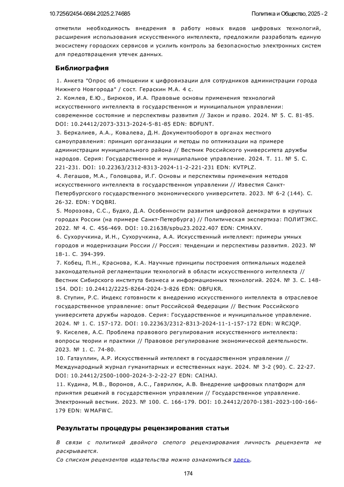 8. Ступин, Р.С. Индекс готовности к внедрению искусственного интеллекта в отраслевое государственное управление: опыт Российской Федерации // Вестник Российского университета дружбы народов. Серия: Государственное и муниципальное управление. 2024. № 1. С. 157-172. DOI: 10.22363/2312-8313-2024-11-1-157-172 EDN: WRCJQP