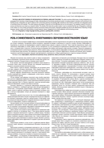 В данной статье исследуется эффективность использования инфографики в качестве педагогического инструмента при обучении иностранному языку для лучшего понимания и запоминания учебного материала, повышения мотивации и вовлеченности студентов в процесс обучения. Инфографика использовалась на занятиях для формирования и развития грамматических навыков и навыков устной речи. Также студентам предлагалось создать свою собственную инфографику на основе учебных текстов и материалов. В статье анализируются преимущества применения данного инструмента и сложности, с которыми можно столкнуться. В качестве метода исследования был выбран качественный в виде опросов и интервью. Результаты проведенного исследования показали положительные результаты. Можно сделать вывод, что использование инфографики способствует созданию более увлекательной и интерактивной среды обучения. При правильном подходе инфографика облегчает и улучшает эффективность обучения иностранному языку, развивает творческое и критическое мышление, повышает заинтересованность, вовлеченность и общую удовлетворенность студентов в процессе обучения.