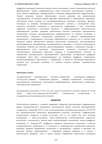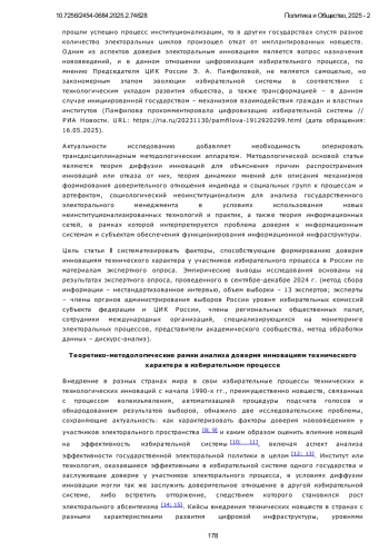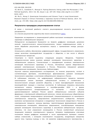 1. Иванов Д. Ю. Политическая активность и доверие избирателей в условиях цифровизации избирательного процесса // Политическая экспертиза: ПОЛИТЭКС. 2024. Т. 20, № 1. С. 45-63. DOI: 10.21638/spbu23.2024.104