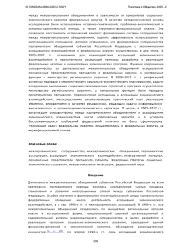 Деятельность межрегиональных объединений субъектов Российской Федерации на всем протяжении постсоветского периода являлась неотъемлемой частью процесса становления и развития интеграционных связей между субъектами Российской Федерации. Особое значение в формировании институциональной среды горизонтальных федеративных отношений имела деятельность ассоциаций экономического взаимодействия, а с сер. 1990-х гг. и межпарламентских ассоциаций.