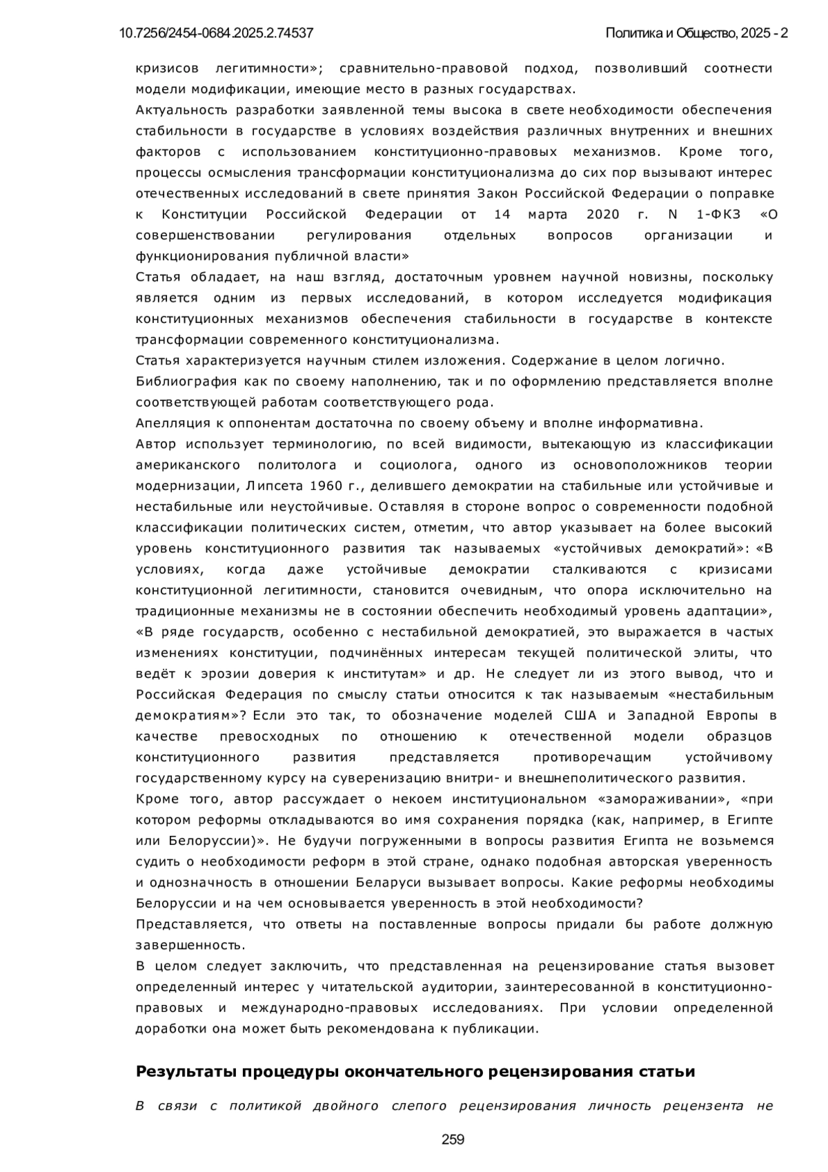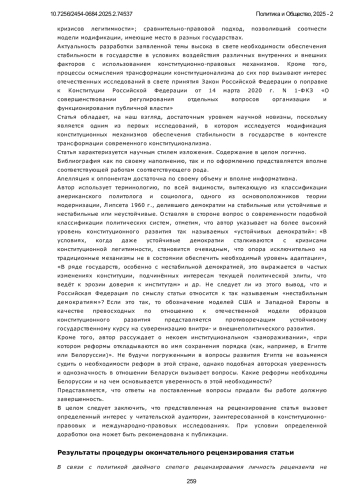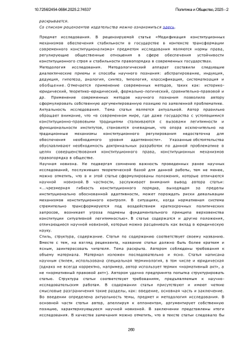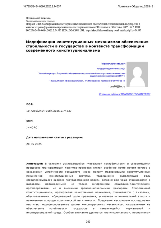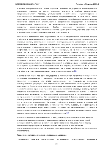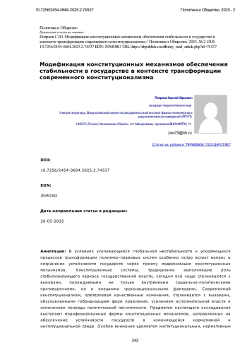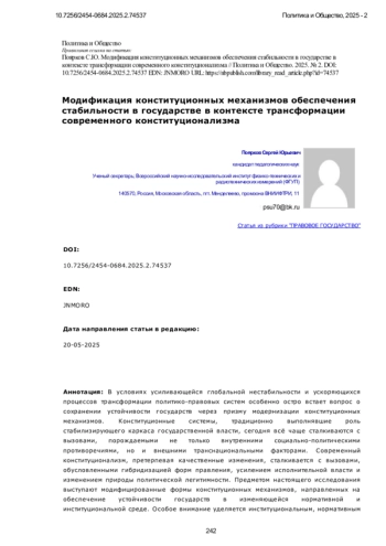 В условиях усиливающейся глобальной нестабильности и ускоряющихся процессов трансформации политико-правовых систем особенно остро встает вопрос о сохранении устойчивости государств через призму модернизации конституционных механизмов. Конституционные системы, традиционно выполнявшие роль стабилизирующего каркаса государственной власти, сегодня всё чаще сталкиваются с вызовами, порождаемыми не только внутренними социально-политическими противоречиями, но и внешними транснациональными факторами. Современный конституционализм, претерпевая качественные изменения, сталкивается с вызовами, обусловленными гибридизацией форм правления, усилением исполнительной власти и изменением природы политической легитимности. Предметом настоящего исследования выступают модифицированные формы конституционных механизмов, направленных на обеспечение устойчивости государств в изменяющейся нормативной и институциональной среде. Особое внимание уделяется институциональным, нормативным и функциональным аспектам трансформации конституционной стабильности. Анализ охватывает как общие закономерности, так и особенности отдельных правовых систем, демонстрирующих альтернативные модели устойчивости. Методология исследования основывается на междисциплинарном подходе, сочетающем доктринальный анализ, сравнительно-правовой метод и элементы политико-правовой герменевтики. Акцент сделан на выявлении устойчивых трендов и вариативных форм модернизации через сопоставление конституционных практик различных государств. Новизна исследования заключается в выявлении скрытых механизмов адаптации конституционного устройства к меняющимся условиям социально-политического существования. Автор предлагает концептуальное разграничение между формальной стабильностью и функциональной устойчивостью, акцентируя внимание на нелинейности этих процессов. В работе обосновано, что модификация конституционных механизмов становится не просто реакцией на вызовы, а формой институциональной эволюции, сопряжённой с изменением парадигмы конституционализма. Сделан вывод о формировании гибридных моделей стабильности, сочетающих элементы традиционных и инновационных решений. Параллельно с этим возрастает значение политической адаптивности как способности правовых и институциональных систем отвечать на вызовы без разрушения легитимной основы власти. Политическая адаптивность предполагает не только гибкость норм, но и способность институтов к внутренней перестройке, сохранению функциональности в условиях кризиса, а также к включению новых акторов и смыслов в правовое поле.