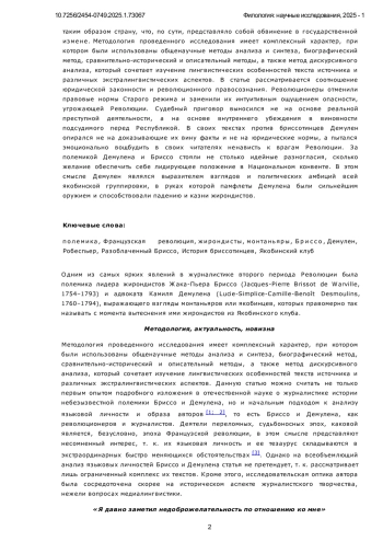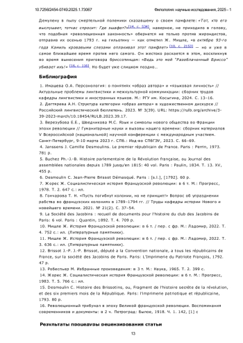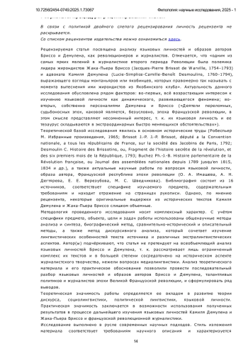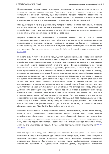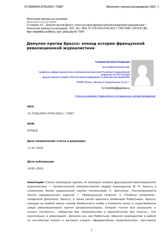 ГОТОВЦЕВА А. Г. ДЕМУЛЕН ПРОТИВ БРИССО: ЭПИЗОД ИСТОРИИ ФРАНЦУЗСКОЙ РЕВОЛЮЦИОННОЙ ЖУРНАЛИСТИКИ // ФИЛОЛОГИЯ: НАУЧНЫЕ ИССЛЕДОВАНИЯ. 2025. № 1