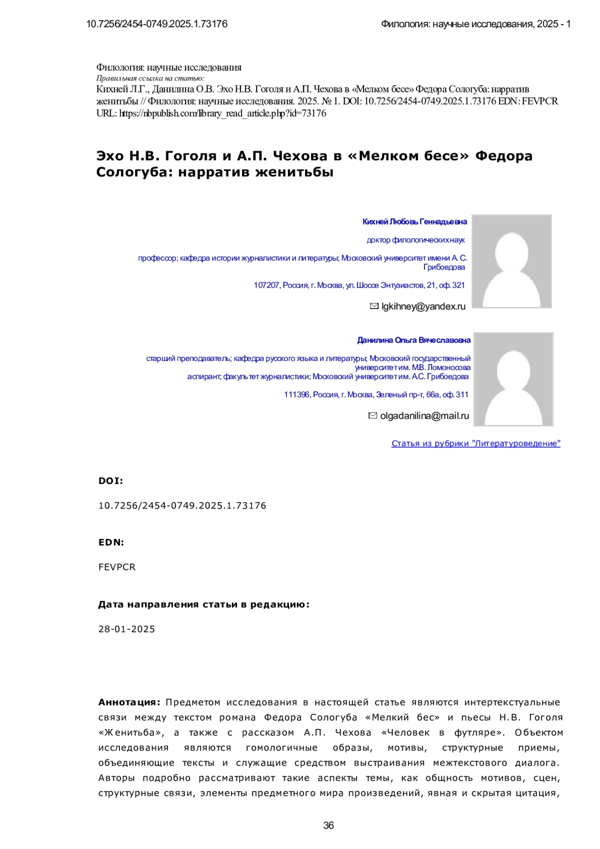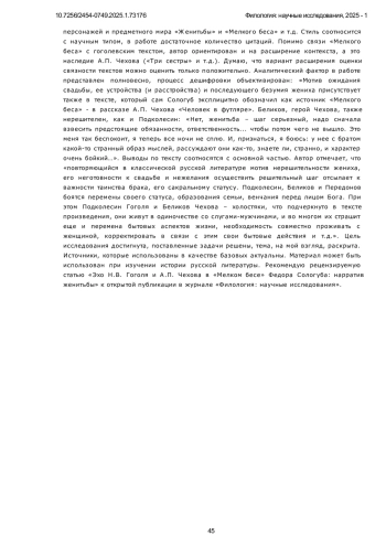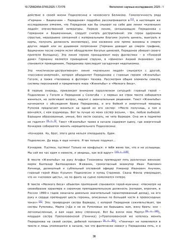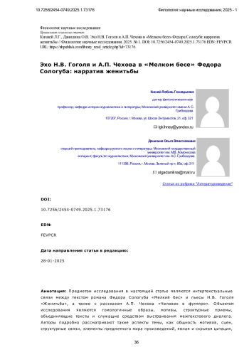 Предметом исследования в настоящей статье являются интертекстуальные связи между текстом романа Федора Сологуба «Мелкий бес» и пьесы Н. В. Гоголя «Женитьба», а также с рассказом А. П. Чехова «Человек в футляре». Объектом исследования являются гомологичные образы, мотивы, структурные приемы, объединяющие тексты и служащие средством выстраивания межтекстового диалога. Авторы подробно рассматривают такие аспекты темы, как общность мотивов, сцен, структурные связи, элементы предметного мира произведений, явная и скрытая цитация, взаимодействие гомологических структур сюжетов двух текстов. Особое внимание уделяется семантико-структурной трансформации мотивов выбора женихов/невест, взаимодействия потенциального жениха / потенциальной невесты со свахой, страха перед грядущей свадьбой, а также карточного гадания/игры с антропоморфизацией карт. В исследовании использован метод сравнения мотивов и их трансформации в межтекстовом диалоге, сопоставления структурных элементов текста и предметного мира произведений. Основными выводами проведенного исследования являются доказанные элементы межтекстового диалога двух произведений, отчетливо верифицированное выявление еще одного источника текста романа Сологуба «Мелкий бес», наряду с уже отрефлексированными произведения классической отечественной литературы. Особым вкладом авторов в исследование темы является систематизация, верификация и подробное описание гомологических, заимствованных и преобразованных автором элементов художественного мира произведения. Научная новизна исследования заключается в проведенном сопоставлении текста романа «Мелкий бес» с текстом драмы «Женитьба», выявлении интертекстуальных связей, стратификации их на различных уровнях организации текста, а также привлечения к проводимому сопоставлению текста «Человек в футляре», связи которого с «Мелким бесом» через призму общих мотивов с «Женитьбой» Н. В. Гоголя ранее не рассматривались.