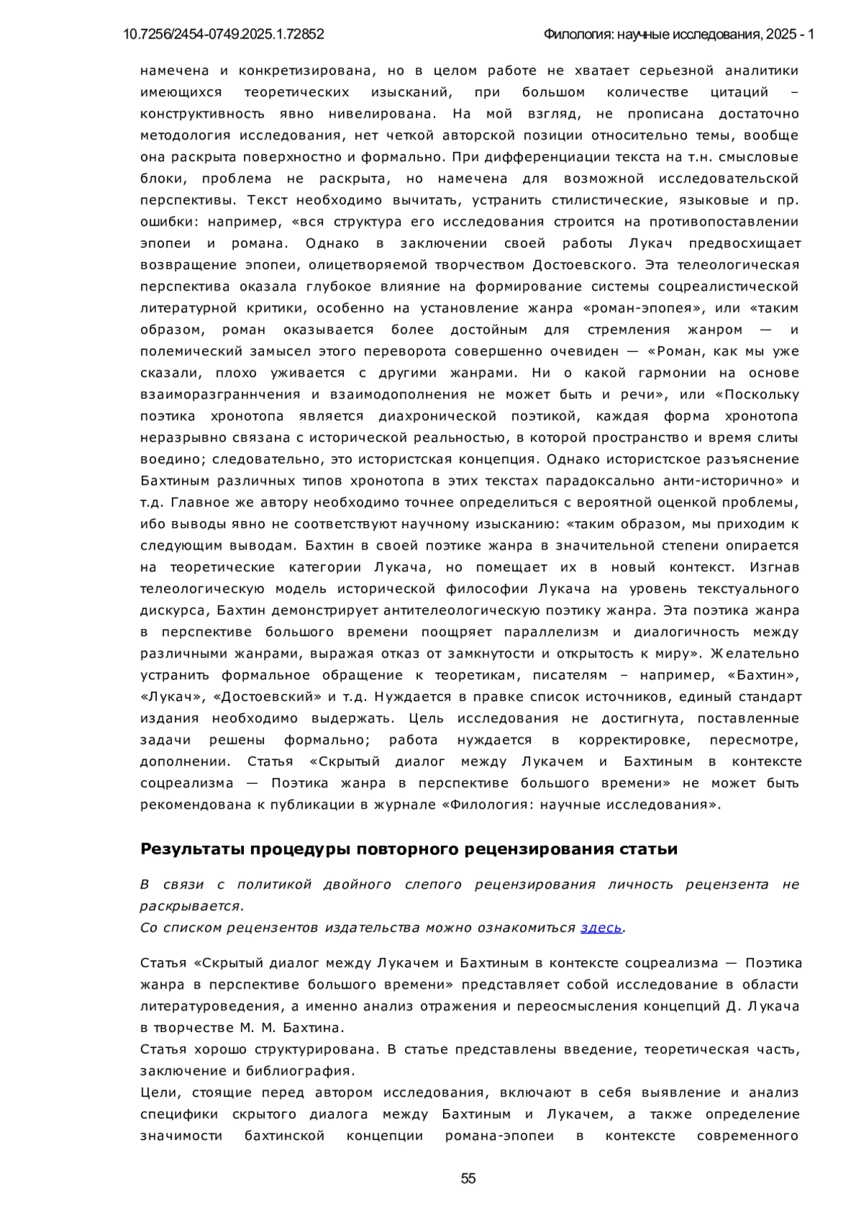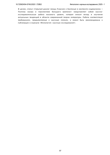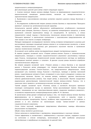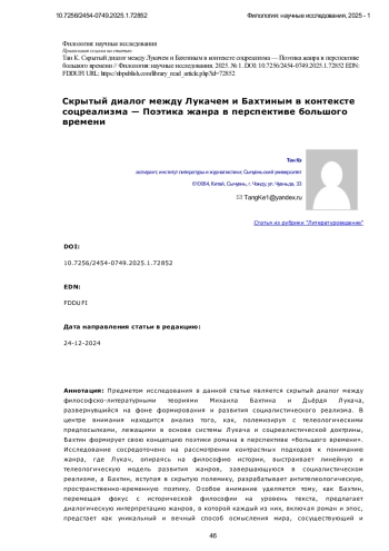 Предметом исследования в данной статье является скрытый диалог между философско-литературными теориями Михаила Бахтина и Дьёрдя Лукача, развернувшийся на фоне формирования и развития социалистического реализма. В центре внимания находится анализ того, как, полемизируя с телеологическими предпосылками, лежащими в основе системы Лукача и соцреалистической доктрины, Бахтин формирует свою концепцию поэтики романа в перспективе «большого времени». Исследование сосредоточено на рассмотрении контрастных подходов к пониманию жанра, где Лукач, опираясь на философию истории, выстраивает линейную и телеологическую модель развития жанров, завершающуюся в социалистическом реализме, а Бахтин, вступая в скрытую полемику, разрабатывает антителеологическую, пространственно-временную поэтику. Особое внимание уделяется тому, как Бахтин, перемещая фокус с исторической философии на уровень текста, предлагает диалогическую интерпретацию жанров, в которой каждый из них, включая роман и эпос, предстает как уникальный и вечный способ осмысления мира, сосуществующий и взаимодействующий в рамках «большого времени», а не стремящийся к историческому завершению. Методология исследования основана на анализе текстов Лукача и Бахтина, с акцентом на выявление скрытых диалогических связей между их теориями, особенно в контексте формирования и развития литературной теории соцреализма. Статья использует сравнительный метод, исследуя различные аспекты поэтики жанра (включая хронотопы, жанровые типы и роли писателей) в работах обоих авторов. Научная новизна данного исследования заключается в выявлении и анализе скрытого диалога между Бахтиным и Лукачем, который не ограничивается сопоставлением их взглядов на роман и эпос, а раскрывает принципиальные различия в их подходах к пониманию исторического процесса и роли литературного жанра. В противовес телеологической концепции Лукача, рассматривающей развитие жанров как линейный процесс, направленный к определенной цели, исследование демонстрирует новаторский характер антителеологической поэтики Бахтина, утверждающей вечное сосуществование и диалог между жанрами. В частности, работа показывает, что в бахтинской концепции “большого времени” жанр, не привязанный к определенной исторической эпохе, выступает не как средство выражения, а как сам способ открытия и осмысления мира, обретая свою значимость в диалоге с другими жанрами.