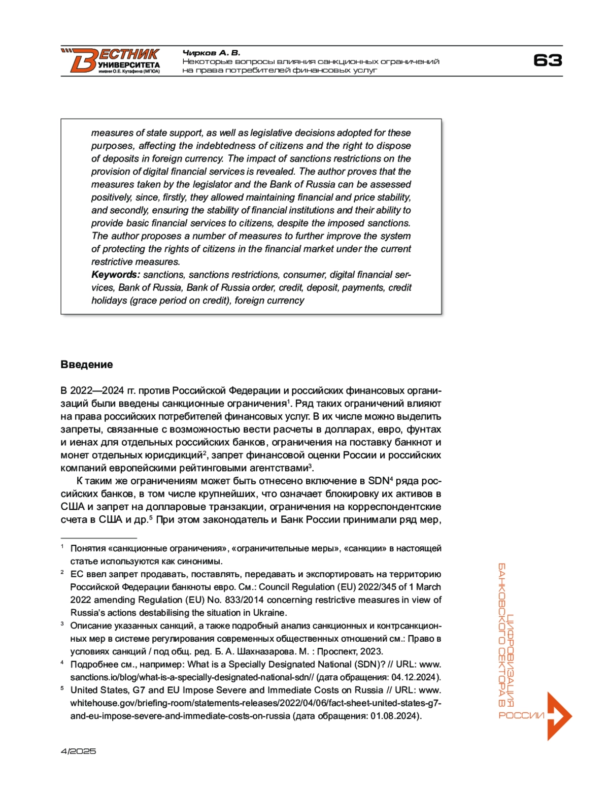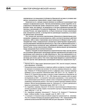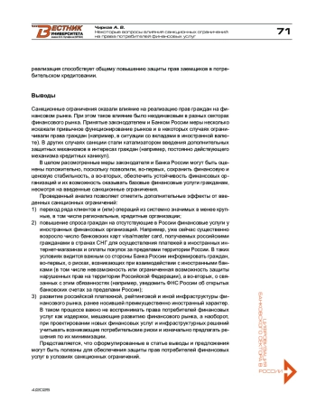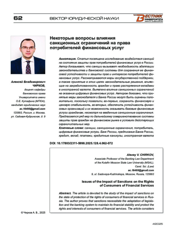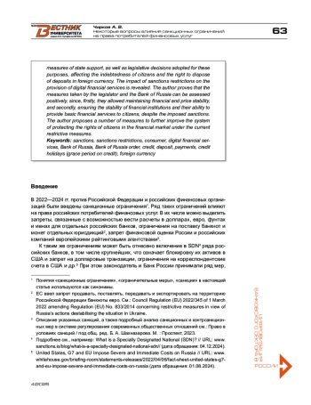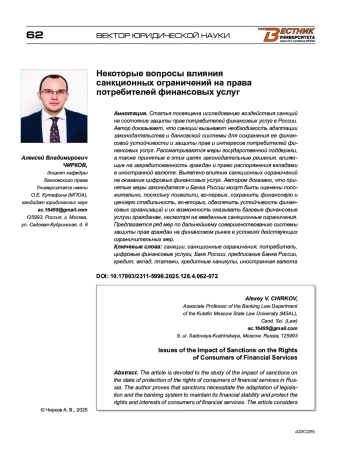 Статья посвящена исследованию воздействия санкций на состояние защиты прав потребителей финансовых услуг в России. Автор доказывает, что санкции вызывают необходимость адаптации законодательства и банковской системы для сохранения ее финансовой устойчивости и защиты прав и интересов потребителей финансовых услуг. Рассматриваются меры государственной поддержки, а также принятые в этих целях законодательные решения, влияющие на закредитованность граждан и право распоряжения вкладами в иностранной валюте. Выявлено влияние санкционных ограничений на оказание цифровых финансовых услуг. Автором доказано, что принятые меры законодателя и Банка России могут быть оценены положительно, поскольку позволили, во-первых, сохранить финансовую и ценовую стабильность, во-вторых, обеспечить устойчивость финансовых организаций и их возможность оказывать базовые финансовые услуги гражданам, несмотря на введенные санкционные ограничения. Предлагается ряд мер по дальнейшему совершенствованию системы защиты прав граждан на финансовом рынке в условиях действующих ограничительных мер.