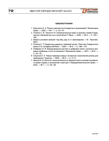 1. Борисенко Е. А. Риски в деятельности кредитных организаций // Финансовое право. - 2020. - № 7. - С. 42-47.