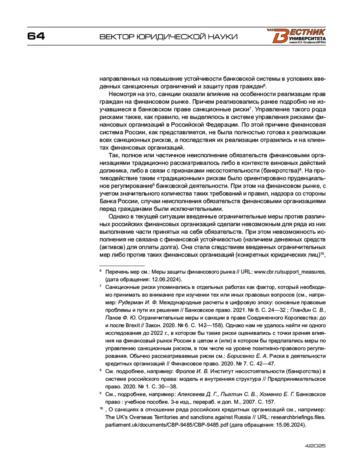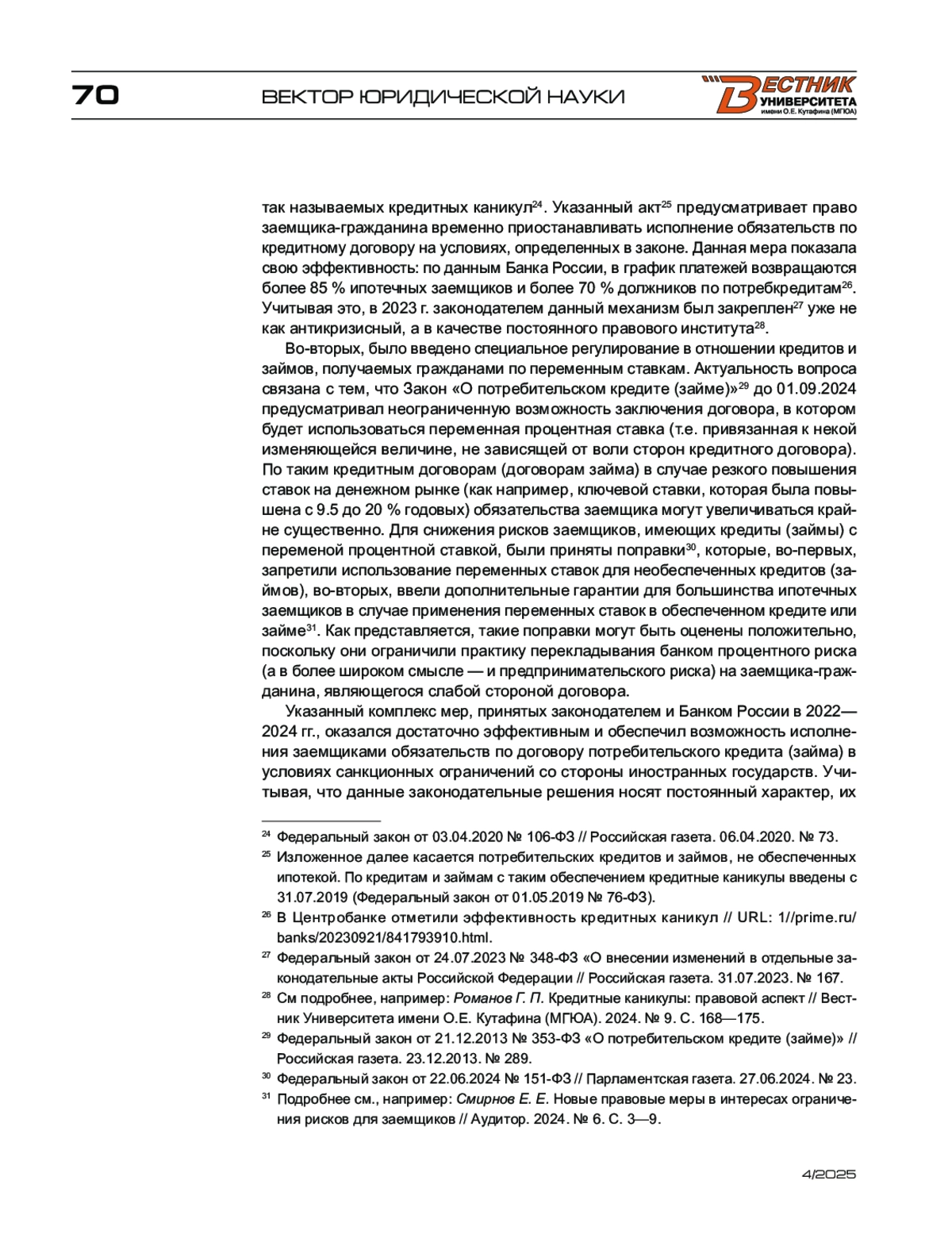 4. Романов Г. П. Кредитные каникулы: правовой аспект // Вестник Университета имени О.Е. Кутафина (МГЮА). - 2024. - № 9. - С. 168-175.