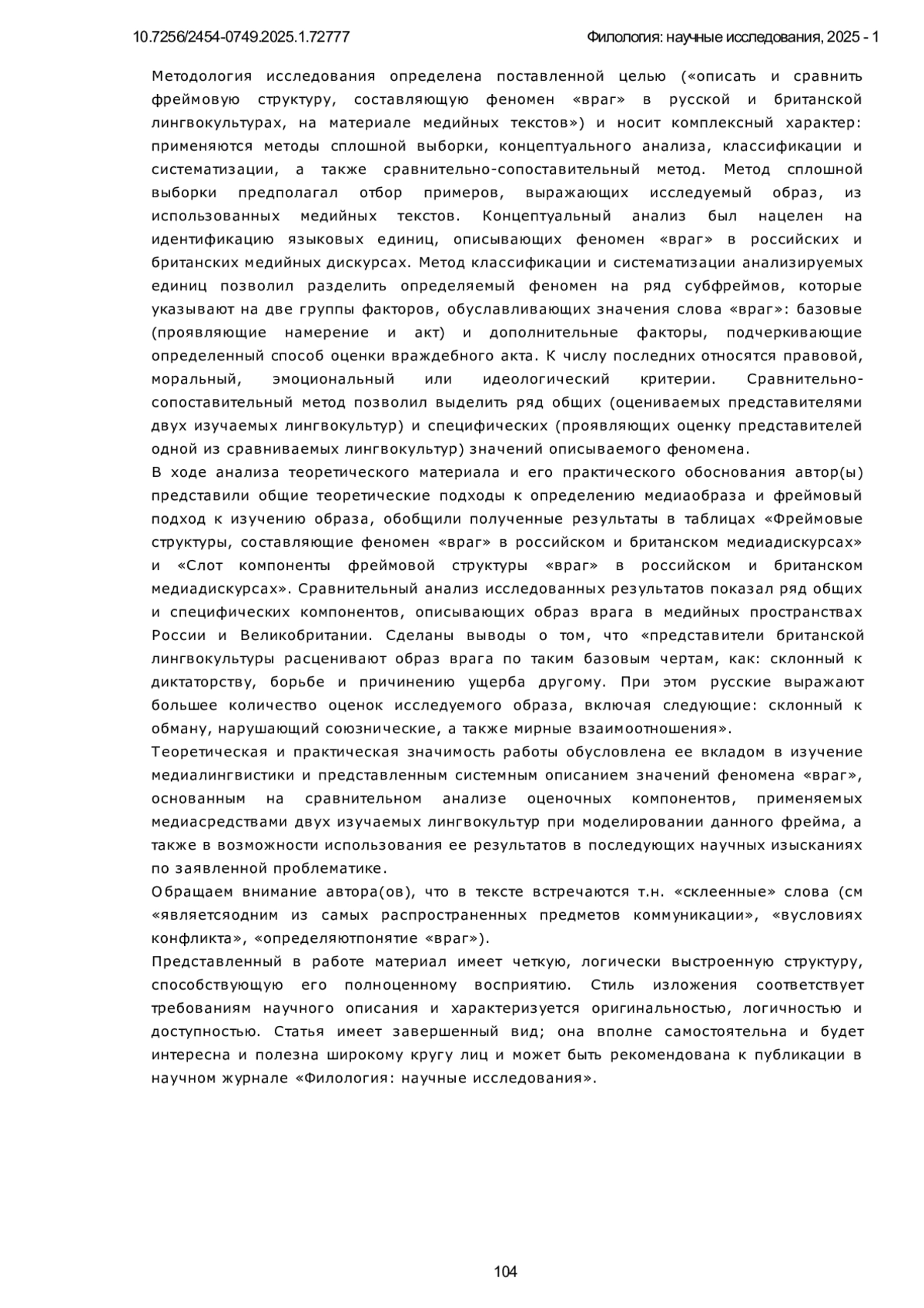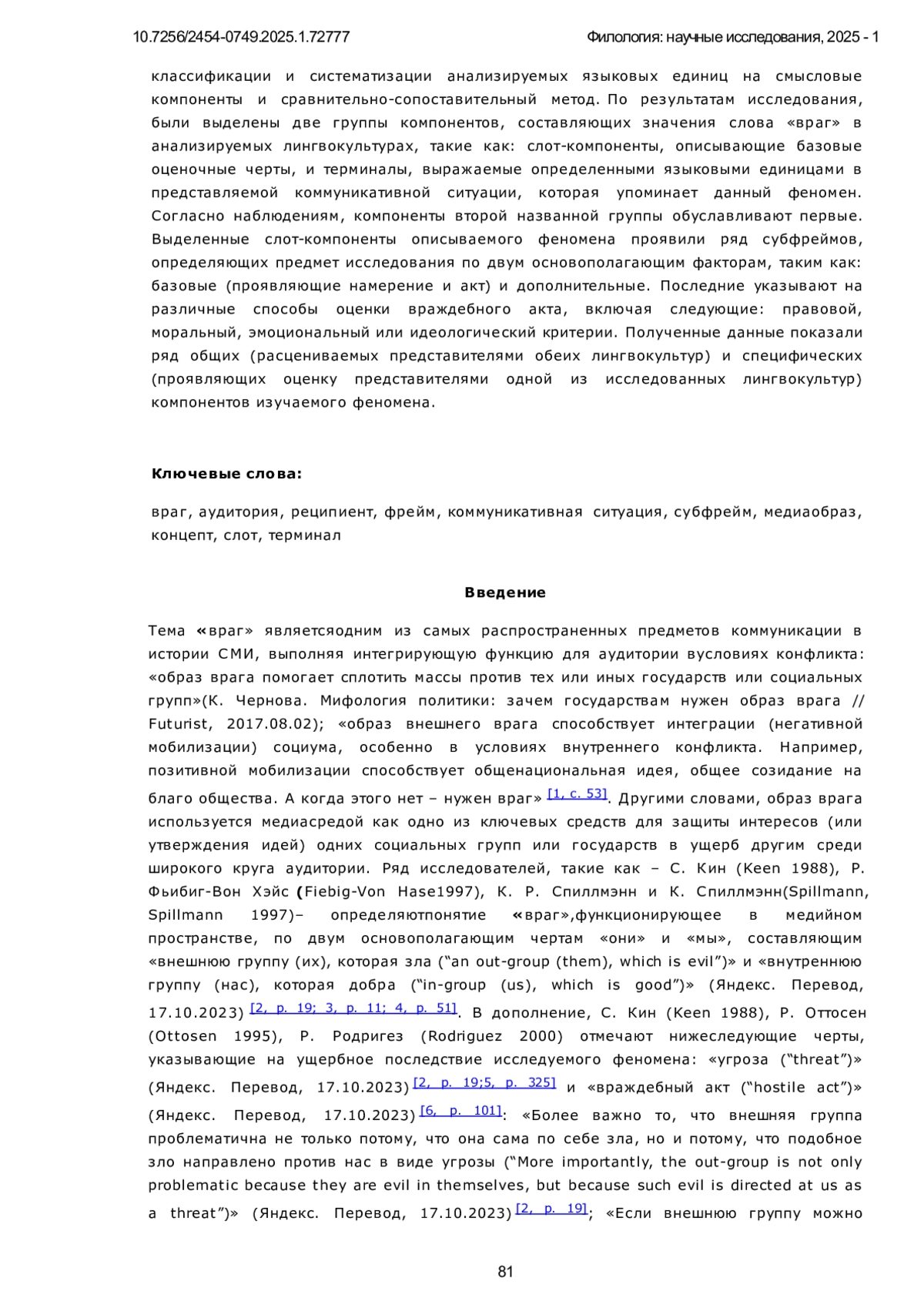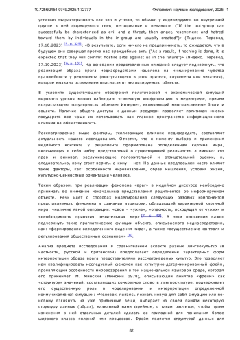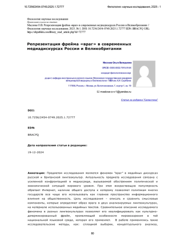 Предметом исследования является феномен “враг” в медийных дискурсах русской и британской лингвокультур. Актуальность предмета исследования связана с усиленной конфронтацией в медиасреде, вызываемой обострением политической и экономической ситуаций мирового уровня. При этом возрастающую популярность обретает Интернет, наличие общего доступа к которому позволяет политикам многих государств все чаще его использовать как главное пространство информационного влияния на общественность. Цель исследования - описать и сравнить смысловые компоненты, которые определяют образ врага в двух анализируемых лингвокультурах, на материале использованных медийных текстов. Сравнительное описание исследуемого феномена в разных лингвокультурах позволяет его квалифицировать как культурно-детерминированный фрейм, проявляющий особенности мировоззрения в той национальной языковой среде, которая его применяет. В работе применялись такие исследовательские методы, как: сплошной выборки, концептуального анализа, классификации и систематизации анализируемых языковых единиц на смысловые компоненты и сравнительно-сопоставительный метод. По результатам исследования, были выделены две группы компонентов, составляющих значения слова «враг» в анализируемых лингвокультурах, такие как: слот-компоненты, описывающие базовые оценочные черты, и терминалы, выражаемые определенными языковыми единицами в представляемой коммуникативной ситуации, которая упоминает данный феномен. Согласно наблюдениям, компоненты второй названной группы обуславливают первые. Выделенные слот-компоненты описываемого феномена проявили ряд субфреймов, определяющих предмет исследования по двум основополагающим факторам, таким как: базовые (проявляющие намерение и акт) и дополнительные. Последние указывают на различные способы оценки враждебного акта, включая следующие: правовой, моральный, эмоциональный или идеологический критерии. Полученные данные показали ряд общих (расцениваемых представителями обеих лингвокультур) и специфических (проявляющих оценку представителями одной из исследованных лингвокультур) компонентов изучаемого феномена.
