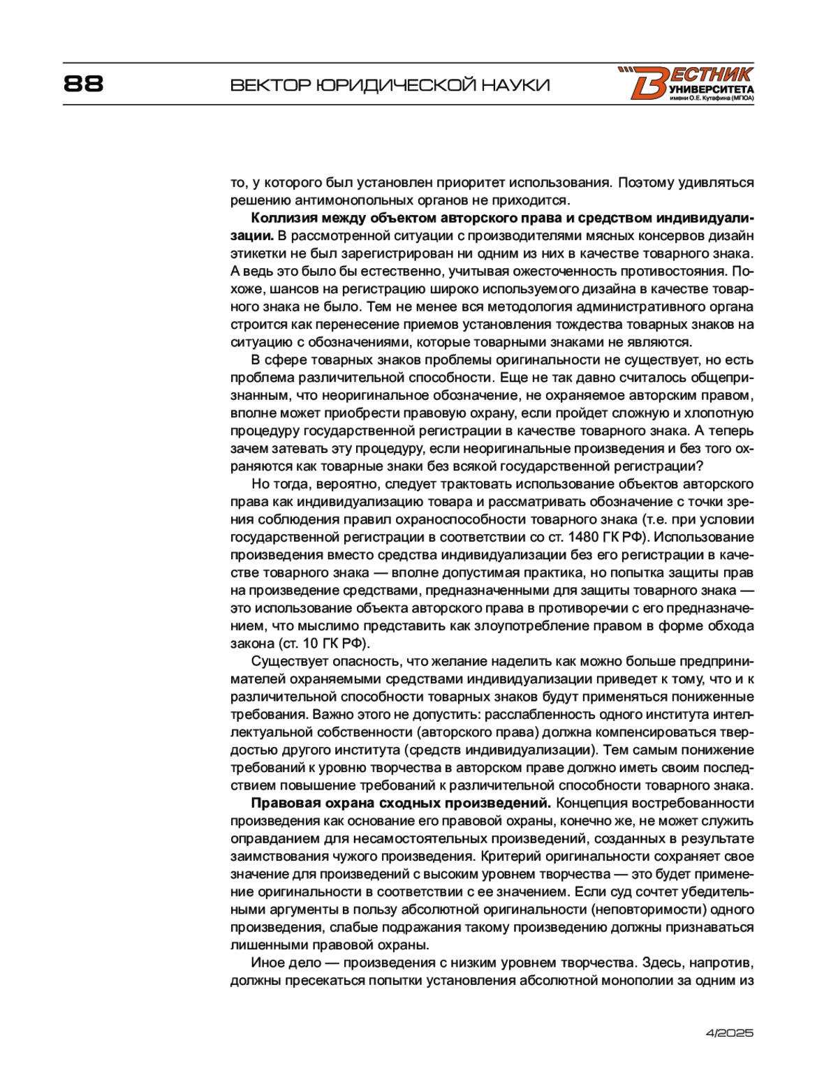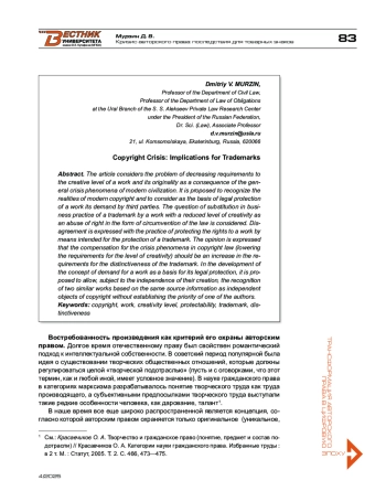 В статье рассматривается проблема снижения требований к творческому уровню произведения и его оригинальности как следствие общих кризисных явлений современной цивилизации. Предлагается признать реалии современного авторского права и рассматривать в качестве основы правовой охраны произведения его востребованность третьими лицами. Рассматривается вопрос подмены в предпринимательской практике товарного знака произведением с пониженным уровнем творчества как злоупотребление правом в форме обхода закона. Выражается несогласие с практикой защиты прав на произведение средствами, предназначенными для защиты товарного знака. Высказывается мнение, что компенсацией кризисных явлений в авторском праве (понижение требований к уровню творчества) должно стать повышение требований к различительной способности товарного знака. В развитие концепции востребованности произведения как основания его правовой охраны предлагается допустить признание двух сходных произведений, опирающихся на одну исходную информацию, при условии независимости их создания, самостоятельными объектами авторского права без установления приоритета одного из авторов.