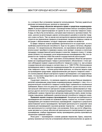 В сфере товарных знаков проблемы оригинальности не существует, но есть проблема различительной способности. Еще не так давно считалось общепризнанным, что неоригинальное обозначение, не охраняемое авторским правом, вполне может приобрести правовую охрану, если пройдет сложную и хлопотную процедуру государственной регистрации в качестве товарного знака.
