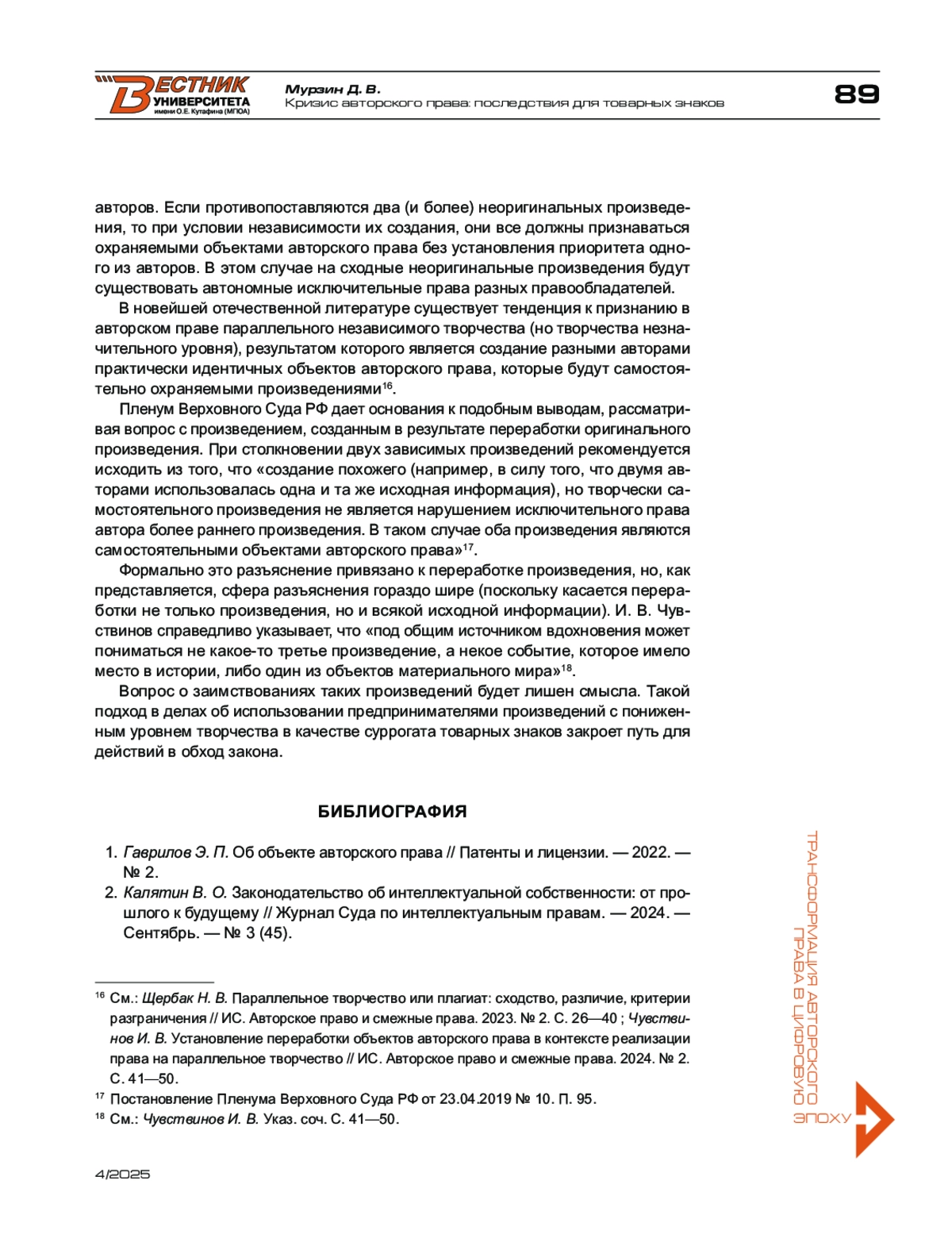 9. Чувствинов И. В. Установление переработки объектов авторского права в контексте реализации права на параллельное творчество // ИС. Авторское право и смежные права. - 2024. - № 2.