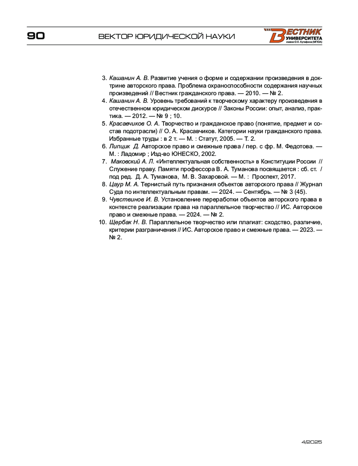3. Кашанин А. В. Развитие учения о форме и содержании произведения в доктрине авторского права. Проблема охраноспособности содержания научных произведений // Вестник гражданского права. - 2010. - № 2.