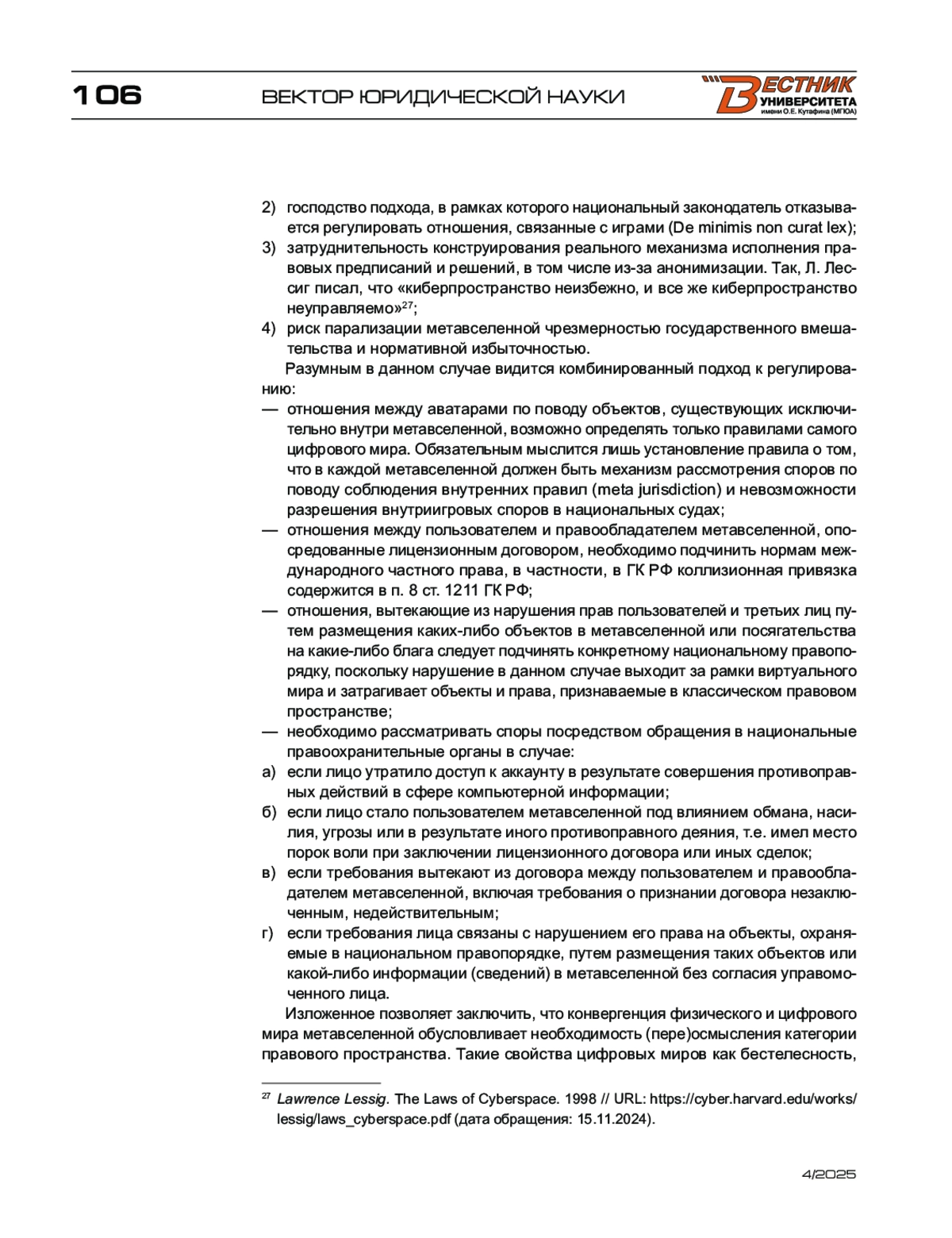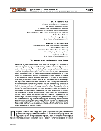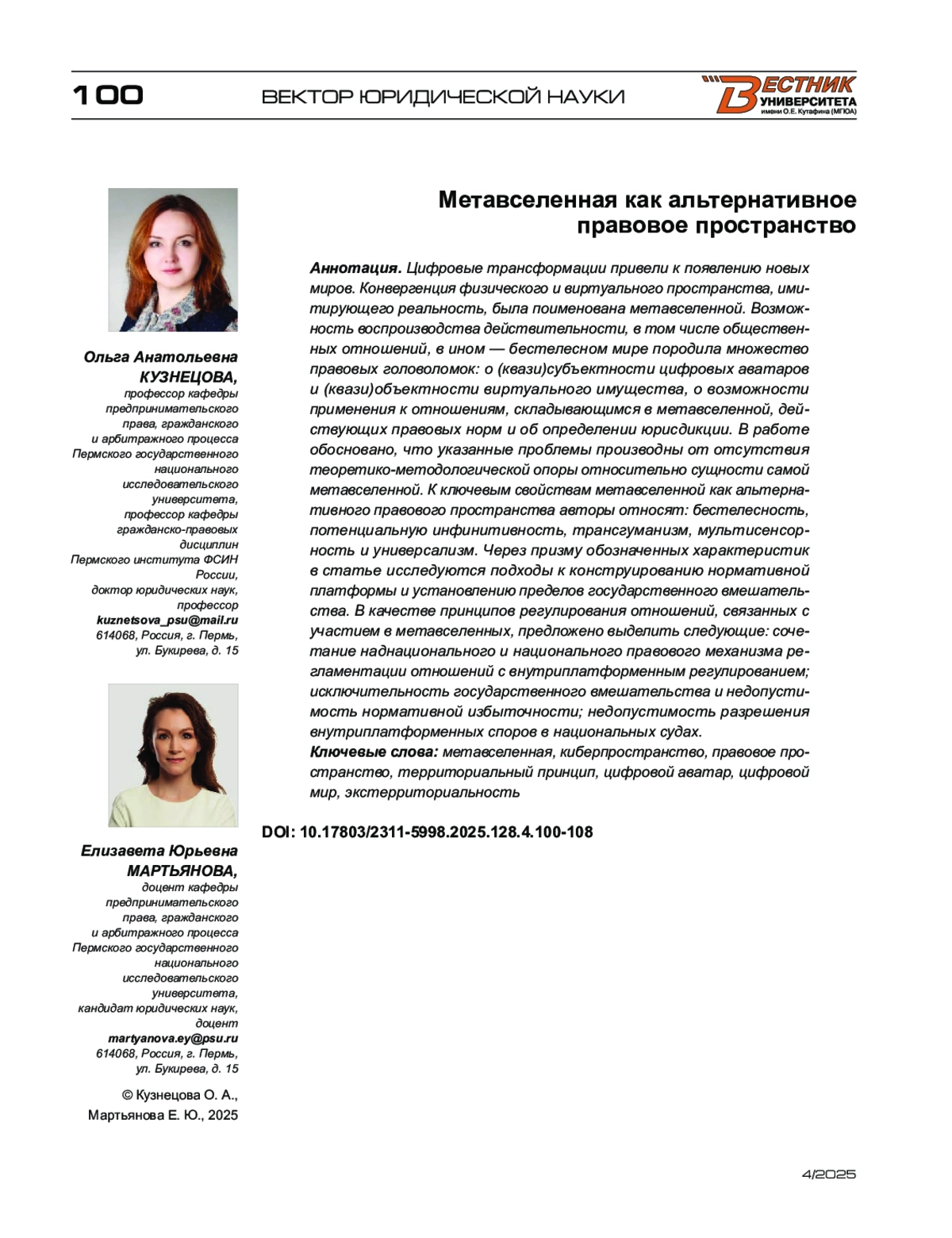 Цифровые трансформации привели к появлению новых миров. Конвергенция физического и виртуального пространства, имитирующего реальность, была поименована метавселенной. Возможность воспроизводства действительности, в том числе общественных отношений, в ином — бестелесном мире породила множество правовых головоломок: о (квази)субъектности цифровых аватаров и (квази)объектности виртуального имущества, о возможности применения к отношениям, складывающимся в метавселенной, действующих правовых норм и об определении юрисдикции. В работе обосновано, что указанные проблемы производны от отсутствия теоретико-методологической опоры относительно сущности самой метавселенной. К ключевым свойствам метавселенной как альтернативного правового пространства авторы относят: бестелесность, потенциальную инфинитивность, трансгуманизм, мультисенсорность и универсализм. Через призму обозначенных характеристик в статье исследуются подходы к конструированию нормативной платформы и установлению пределов государственного вмешательства. В качестве принципов регулирования отношений, связанных с участием в метавселенных, предложено выделить следующие: сочетание наднационального и национального правового механизма регламентации отношений с внутриплатформенным регулированием; исключительность государственного вмешательства и недопустимость нормативной избыточности; недопустимость разрешения внутриплатформенных споров в национальных судах.