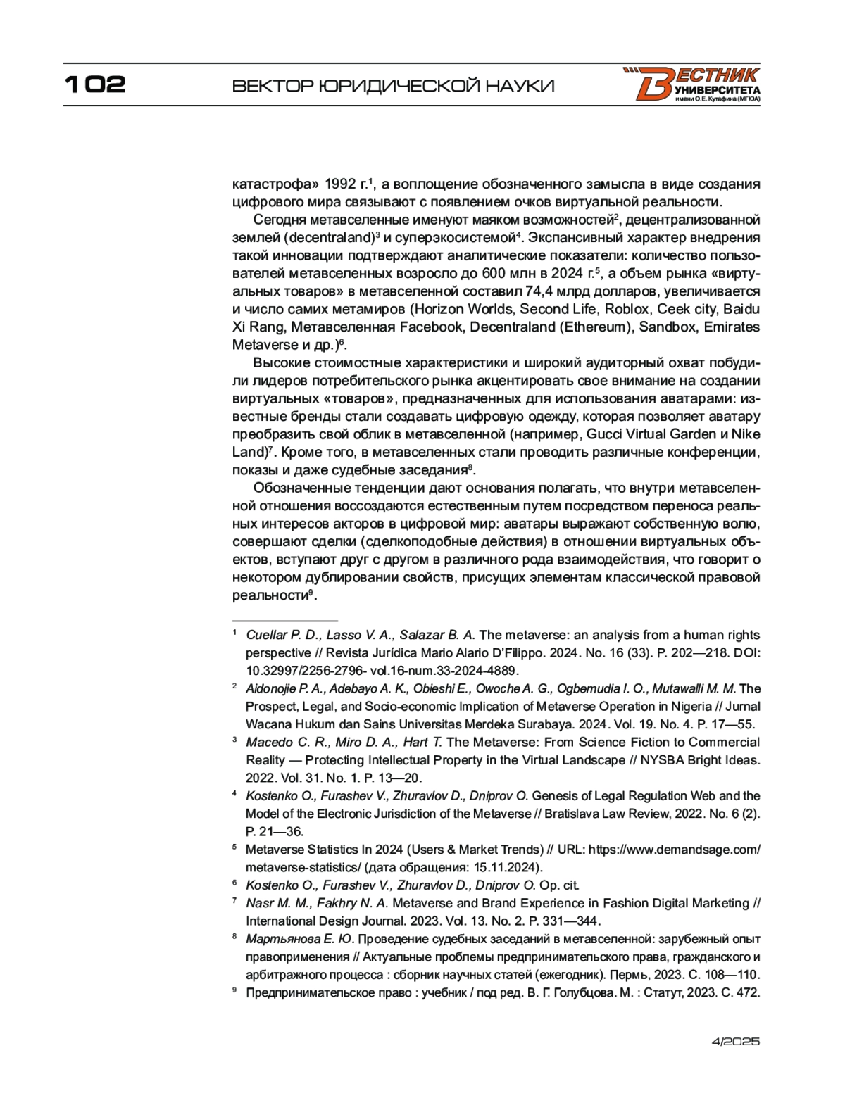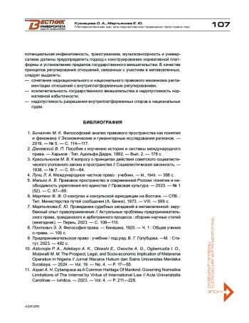 7. Мартьянова Е. Ю. Проведение судебных заседаний в метавселенной: зарубежный опыт правоприменения // Актуальные проблемы предпринимательского права, гражданского и арбитражного процесса: сборник научных статей (ежегодник). - Пермь, 2023. - С. 108-110.