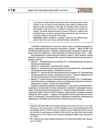 13.06.2024 в Европейском союзе был принят закон, регламентирующий вопросы, касающиеся искусственного интеллекта. Затронул он и вопросы защиты авторских прав. Сложности в применении нового закона неизбежно связаны с проблемами реализации положений уже существующей нормативной базы касательно регулирования вопросов авторского и смежного права на едином цифровом рынке ЕС. Майнинг данных в целях обучения искусственного интеллекта зачастую сопряжен с необходимостью использования произведений и баз данных. В этом случае налицо столкновение, с одной стороны, интересов правообладателей таких объектов, а с другой — интересов создателей моделей и систем искусственного интеллекта. Законодательство ЕС предлагает решение указанной проблемы. В то же время такое решение сложно признать оптимальным. В статье рассматриваются ключевые положения указанного закона в преломлении к обозначенной проблематике, а также анализируются зарубежные доктринальные источники и делается вывод по результатам рассмотрения.