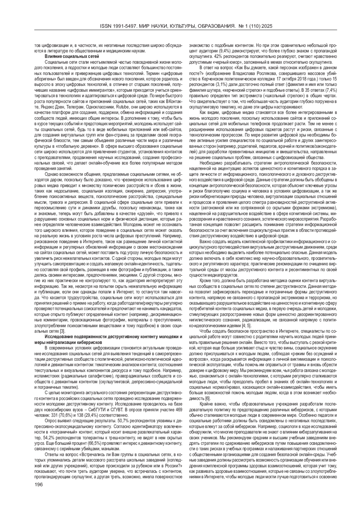 3. Арифханова С.Н., Райков А.В. Исследование воздействия деструктивного контента на молодёжную аудиторию. Современное образование. 2021; № 6 (103): 36-43. Available at: https://cyberleninka.rU/article/n/issledovanie-vozdeystviya-destruktivnogo-kontenta-na-molodyozhnuyu-auditoriyu.