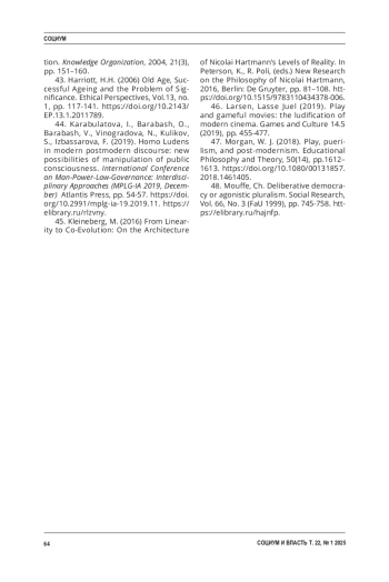 44. Karabulatova, I., Barabash, O., Barabash, V., Vinogradova, N., Kulikov, S., Izbassarova, F. (2019). Homo Ludens in modern postmodern discourse: new possibilities of manipulation of public con sciousness. // International Conference on Man-Power-Law-Governance: Interdisciplinary Approaches (MPLG-IA 2019, December) Atlantis Press. - Pp. 54-57. DOI: 10.2991/mplg-ia-19.2019.11 EDN: RLZVNY