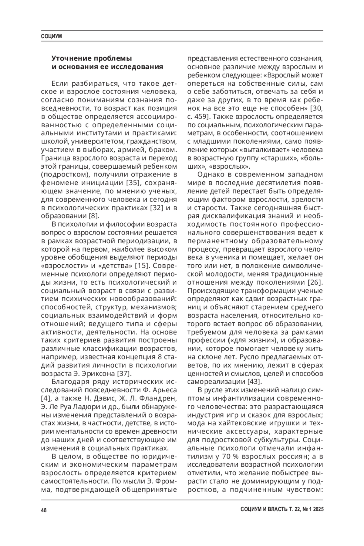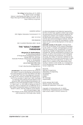 Введение. В статье изложены результаты исследования, имевшего своей целью выработку философско-антропологической концепции, определяющей идеал «человека взрослого». Логика исследования включила проблематизацию самого понятия «человека взрослого», с уточнением его значения и очерчиванием границ его смыслового поля, при этом произведено различение проблемы антропологического модуса зрелости, или «человека взрослого», то есть способа бытия и состояния человека, противопоставляемого не детству, но способам бытия и состояниям незрелости, проявляющимся у взрослых, и проблематики философии и психологии возраста.