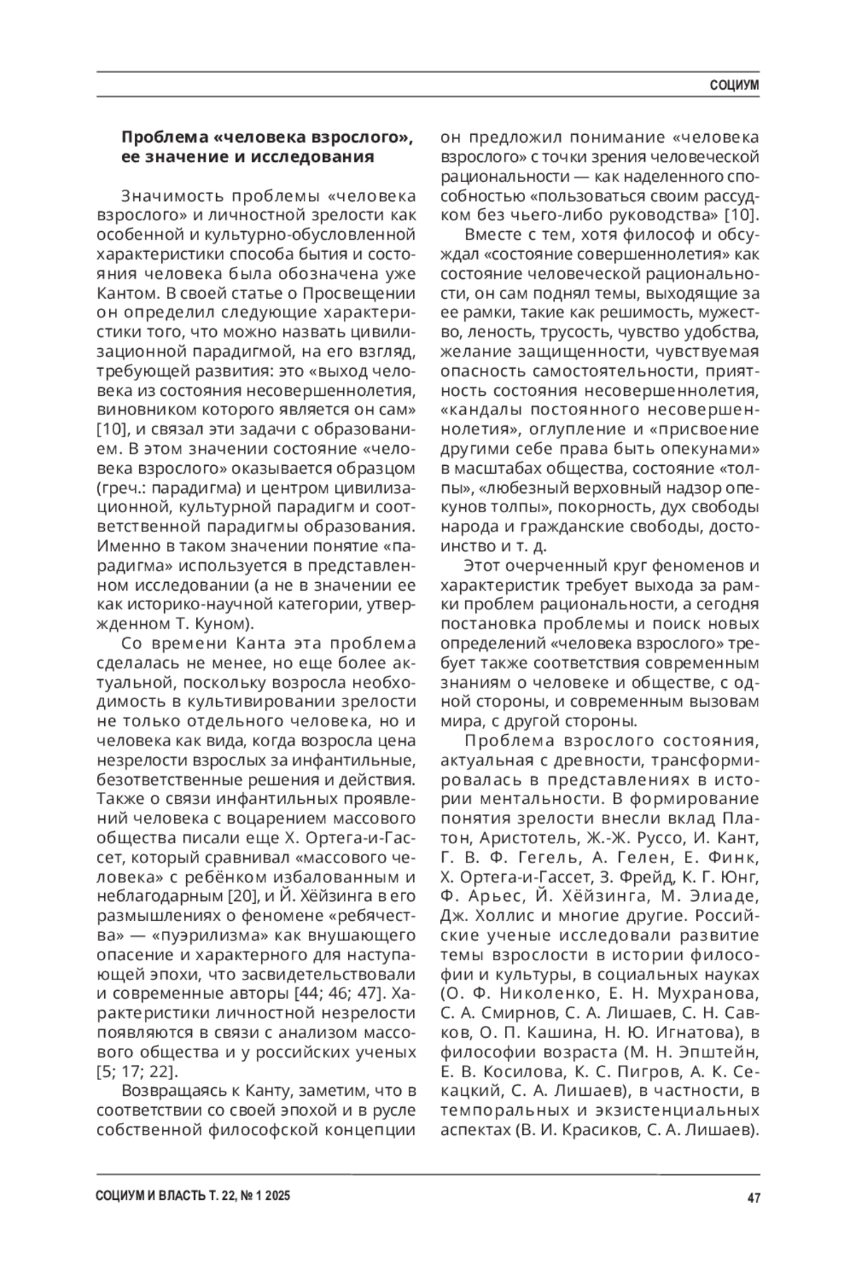 Введение. В статье изложены результаты исследования, имевшего своей целью выработку философско-антропологической концепции, определяющей идеал «человека взрослого». Логика исследования включила проблематизацию самого понятия «человека взрослого», с уточнением его значения и очерчиванием границ его смыслового поля, при этом произведено различение проблемы антропологического модуса зрелости, или «человека взрослого », то есть способа бытия и состояния человека, противопоставляемого не детству, но способам бытия и состояниям незрелости, проявляющимся у взрослых, и проблематики философии и психологии возраста. Анализ модусов зрелости и незрелости в исследовании опирается преимущественно на феноменологический и диалектический подходы, первый из которых применен для обнаружения и анализа значимых для исследования проблемы феноменов человеческого бытия и включил, в частности, дескрипцию и анализ человеческой повседневности и социально-феноменологический метод, а второй позволил исследовать противоречивую, подвижную природу человека и развитие состояния «человека взрослого». Научной новизной в работе отличаются прежде всего выработанные автором основания исследования: комплексная антропологическая концепция, c утверждением «слоистости» опыта человека, способного интегрировать в себе бытийную множественность человека, и философская концепция субъектности; а также сама концепция антропологических модусов зрелости и незрелости. В результате исследования модус зрелости определен как полное выявление сущностных характеристик в каждом из слоев человеческого опыта, а также способности действия относительно другого/Других (функционирования в отношении мира), вследствие развития, реализующего развертывание человеческой субъектности.