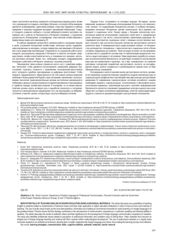 9. Al’bahiri M.H., Al’hadzh A.M. RoT vizual’nogo ‘elementa v razgovornom anglijskom diskurse: vliyanie tehnologij You Tube na zanyatiya po anglijskomu kak inostrannomu. 2020. Available at:. DOI: 10.1108/EL-07-2019-0172