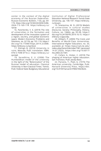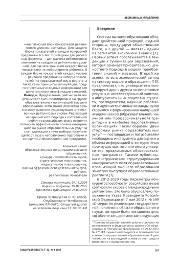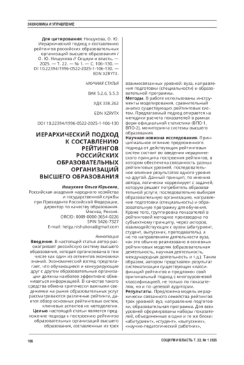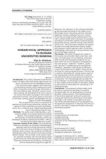 Выводы. Предлагаемая рейтинговая модель может быть пилотирована на группе образовательных организаций высшего образования, либо может логически лечь в основу развития существующих отечественных рейтинговых систем. Реализация иерархического подхода к составлению рейтингов российских вузов позволит повысить эффективность обмена информацией на рынке образовательных услуг за счет адаптации к пути выбора поступающего: от вуза к направлению подготовки и конкретной образовательной программе.