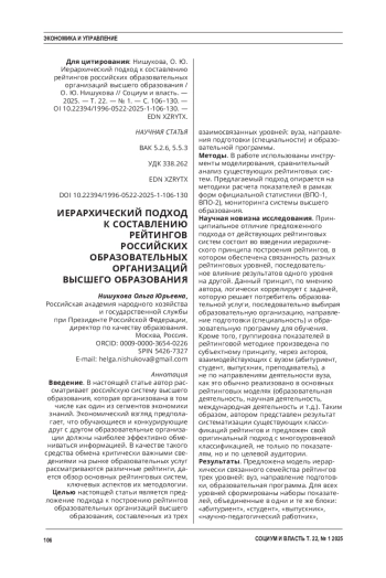 Введение. В настоящей статье автор рассматривает российскую систему высшего образования, которая организована в том числе как один из сегментов экономики знаний. Экономический взгляд предполагает, что обучающиеся и конкурирующие друг с другом образовательные организации должны наиболее эффективно обмениваться информацией. В качестве такого средства обмена критически важными сведениями на рынке образовательных услуг рассматриваются различные рейтинги, дается обзор основных рейтинговых систем, ключевых аспектов их методологии. Целью настоящей статьи является предложение подхода к построению рейтингов образовательных организаций высшего образования, составленных из трех взаимосвязанных уровней: вуза, направления подготовки (специальности) и образовательной программы.