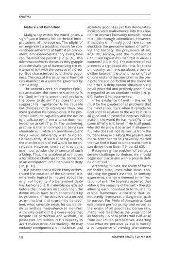 Malignancy within the world poses a significant dilemma for all theistic inter - pretations of the cosmos. The plight of evil engenders a troubling inquiry for conventional adherents of faith: if an omnipotent, omnibenevolent entity exists, how can malevolence persist? [12, p. 39]. This dilemma confronts theists as they grapple with the challenge of harmonizing the existence of evil with the concept of a Creator God characterized by ultimate goodness. The crux of the issue lies in how evil can manifest in a universe governed by such a deity