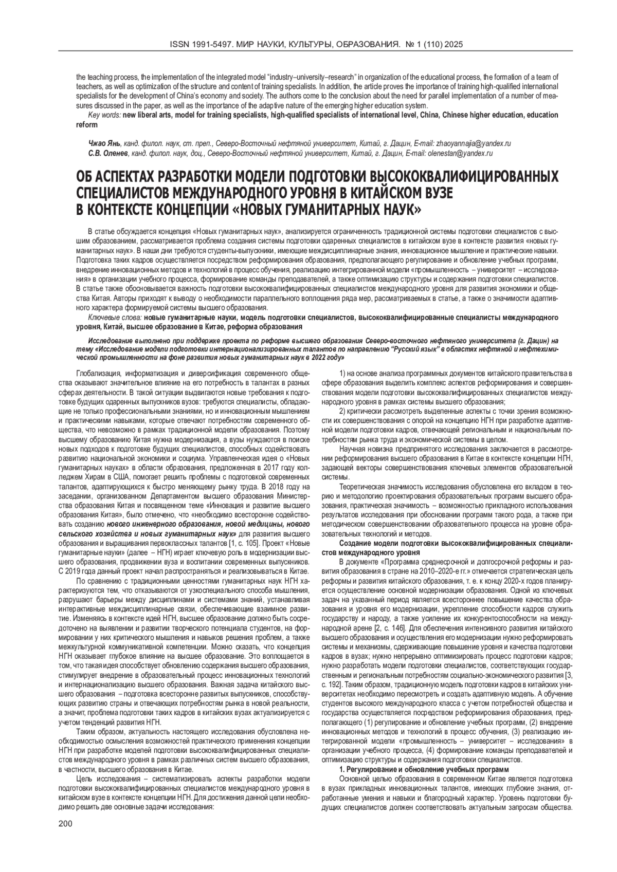 В статье обсуждается концепция «Новых гуманитарных наук», анализируется ограниченность традиционной системы подготовки специалистов с высшим образованием, рассматривается проблема создания системы подготовки одаренных специалистов в китайском вузе в контексте развития «новых гуманитарных наук». В наши дни требуются студенты-выпускники, имеющие междисциплинарные знания, инновационное мышление и практические навыки. Подготовка таких кадров осуществляется посредством реформирования образования, предполагающего регулирование и обновление учебных программ, внедрение инновационных методов и технологий в процесс обучения, реализацию интегрированной модели «промышленность - университет - исследования» в организации учебного процесса, формирование команды преподавателей, а также оптимизацию структуры и содержания подготовки специалистов. В статье также обосновывается важность подготовки высококвалифицированных специалистов международного уровня для развития экономики и общества Китая. Авторы приходят к выводу о необходимости параллельного воплощения ряда мер, рассматриваемых в статье, а также о значимости адаптивного характера формируемой системы высшего образования.