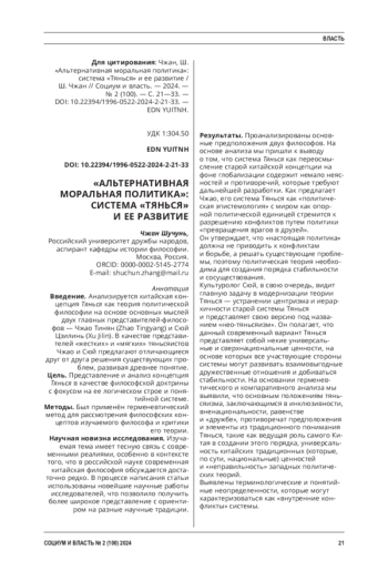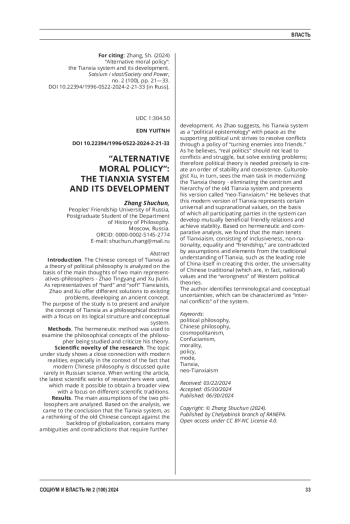 Введение. Анализируется китайская концепция Тянься как теория политической философии на основе основных мыслей двух главных представителей-философов - Чжао Тинян (Zhao Tingyang) и Сюй Цзилинь (Xu Jilin). В качестве представителей «жестких» и «мягких» тяньсяистов Чжао и Сюй предлагают отличающиеся друг от друга решения существующих проблем, развивая древнее понятие.