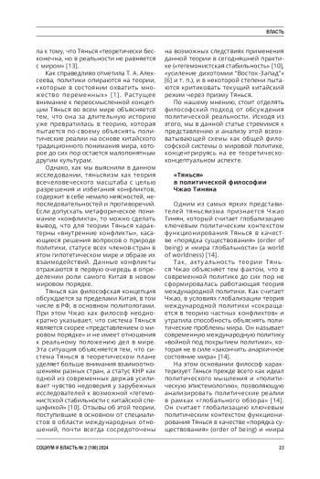 Результаты. Проанализированы основные предположения двух философов. На основе анализа мы пришли к выводу о том, что система Тянься как переосмысление старой китайской концепции на фоне глобализации содержит немало неясностей и противоречий, которые требуют дальнейшей разработки. Как предлагает Чжао, его система Тянься как «политическая эпистемология» с миром как опорной политической единицей стремится к разрешению конфликтов путем политики «превращения врагов в друзей». Он утверждает, что «настоящая политика» должна не приводить к конфликтам и борьбе, а решать существующие проблемы, поэтому политическая теория необходима для создания порядка стабильности и сосуществования. Культуролог Сюй, в свою очередь, видит главную задачу в модернизации теории Тянься - устранении центризма и иерархичности старой системы Тянься и представляет свою версию под названием «нео-тяньсяизм». Он полагает, что данный современный вариант Тянься представляет собой некие универсальные и сверхнациональные ценности, на основе которых все участвующие стороны системы могут развивать взаимовыгодные дружественные отношения и добиваться стабильности. На основании герменевтического и компаративного анализа мы выявили, что основным положениям тяньсяизма, заключающимся в инклюзивности, вненациональности, равенстве и «дружбе», противоречат предположения и элементы из традиционного понимания Тянься, такие как ведущая роль самого Китая в создании этого порядка, универсальность китайских традиционных (которые, по сути, национальные) ценностей и «неправильность» западных политических теорий. Выявлены терминологические и понятийные неопределенности, которые могут характеризоваться как «внутренние конфликты » системы.
