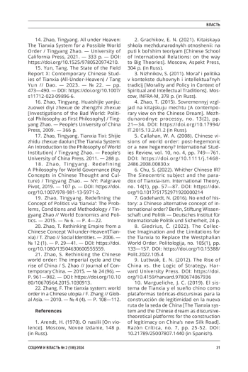 15. Yun, Tang. The State of the Field Report X: Contemporary Chinese Studies of Tianxia (All-Under-Heaven) / Tang Yun // Dao. - 2023. - № 22. - pp. 473-490. -. DOI: 10.1007/s11712-023-09896-6 EDN: ELORMV