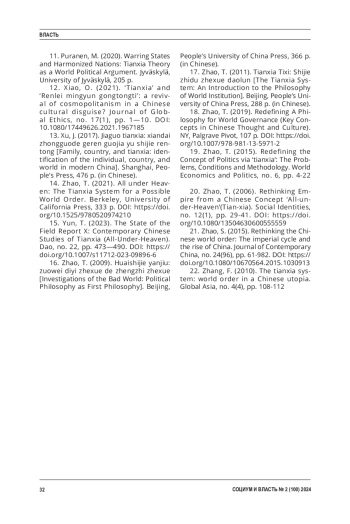 17. Zhao, Tingyang. Tianxia Tixi: Shijie zhidu zhexue daolun [The Tianxia System: An Introduction to the Philosophy of World Institution] / Tingyang Zhao. - People’s University of China Press, 2011. - 288 p.