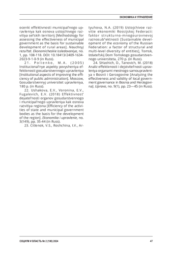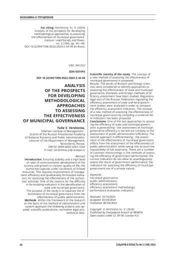 ВЕРШИНИНА Ю. В. АНАЛИЗ ПЕРСПЕКТИВ РАЗВИТИЯ МЕТОДИЧЕСКИХ ПОДХОДОВ К ОЦЕНКЕ ЭФФЕКТИВНОСТИ МУНИЦИПАЛЬНОГО УПРАВЛЕНИЯ // СОЦИУМ И ВЛАСТЬ. 2024. № 2 (100)