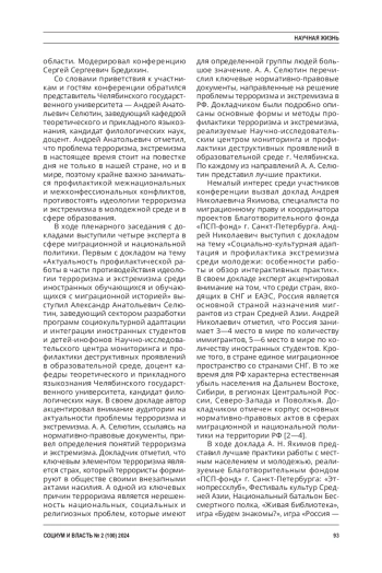 28 февраля 2024 года Научно-исследовательским центром мониторинга и профилактики деструктивных прояв - ленийв образовательной среде и Ко - ординационным центром по вопросам формирования у молодежи активной гражданской позиции, предупреждения межнациональных и межконфессиональных конфликтов, противодействия идеологии терроризма и профилактики экстремизма Челябинского государственного университета при поддержке аппарата Антитеррористической комиссии Челябинской области проведена I Всероссийская научно-практическая конференция с международным участием «Мониторинг. Образование. Безопасность: особенности организации профилактики террористических и экстремистских проявлений в образовательной и молодежной среде в кон - тексте региональных миграционных процессов». Конференция проводилась в рамках реализации Комплексного плана противодействия идеологии терроризма на 2024-2028 годы, утвержденного Президентом РФ от 30.12.2023 г. и была посвящена актуальным проблемам региональных миграционных процессов, противодействию развития и распространения идеологии терроризма и экстремизма среди молодежи, в том числе в образовательной среде