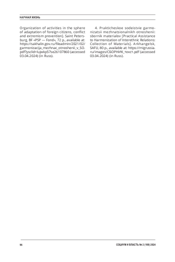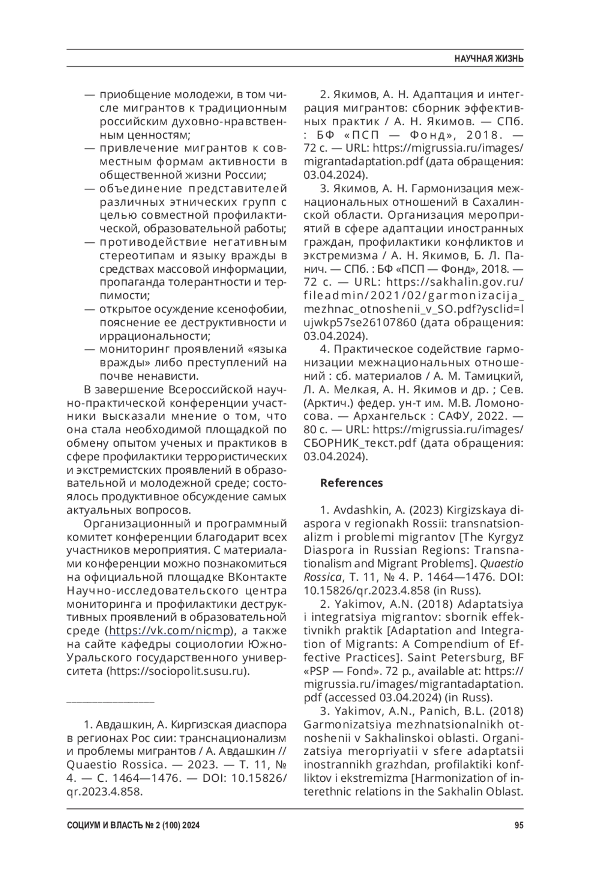3. Якимов, А. Н. Гармонизация межнациональных отношений в Сахалинской области. Организация мероприятий в сфере адаптации иностранных граждан, профилактики конфликтов и экстремизма / А. Н. Якимов, Б. Л. Панич. - СПб.: БФ “ПСП - Фонд”, 2018. - 72 с. - URL: https://sakhalin.gov.ru/fileadmin/2021/02/garmonizacija_mezhnac_otnoshenii_v_SO.pdf?ysclid=lujwkp57se26107860 (дата обращения: 03.04.2024).