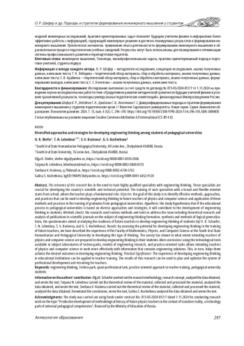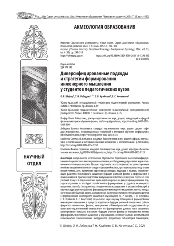 Цель: выявление эффективных методик, подходов и практик, способствующих развитию инженерного мышления будущих учителей физики и информатики и применения их в практике подготовки выпускников педагогических вузов. Гипотеза: если учебный процесс в педагогических вузах будет опираться на диверсифицированные подходы и стратегии, то это будет способствовать формированию у студентов инженерного мышления. Методы (инструменты): теоретическое исследование и анализ публикаций в научных журналах по проблеме формирования инженерного мышления; синтез; методы логических обобщений; анкета, направленная на изучение готовности будущих педагогов к формированию инженерного мышления обучающихся (O. Р. Шeфeр, Т. Н. Лeбeдeва, С. В. Крaйнeва, Г. С. Кочеткова).