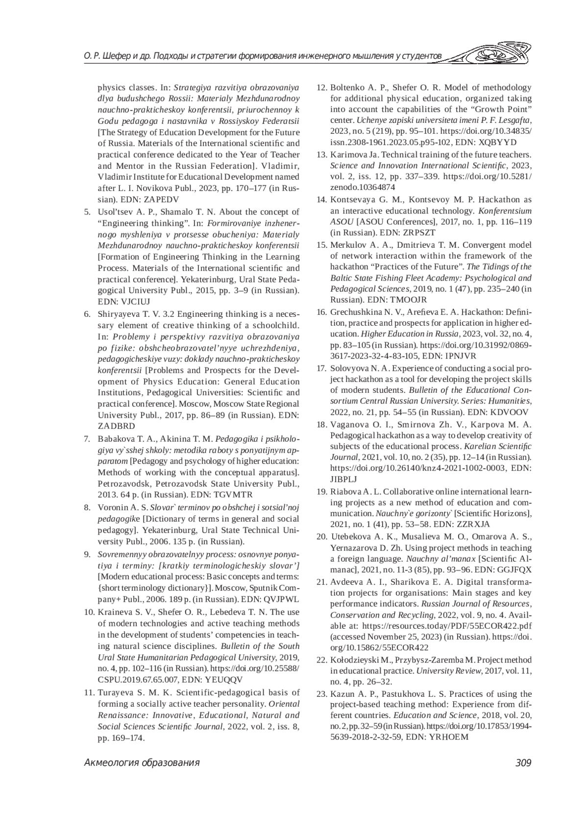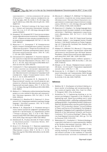 4. Фокина С. В., Куприянова М. В. Формирование инженерного мышления школьников через проектно-исследовательскую деятельность в условиях урочной и внеурочной деятельности на занятиях математики и физики // Стратегия развития образования для будущего России: материалы Международной научно-практической конференции, приуроченной к Году педагога и наставника в Российской Федерации (Владимир, 16-17 марта 2023 г.): в 2 ч. Владимир: Государственное автономное образовательное учреждение дополнительного профессионального образования Владимирской области Владимирский институт развития образования имени Л. И. Новиковой, 2023. Ч. 1. С. 170-177. EDN: ZAPEDV