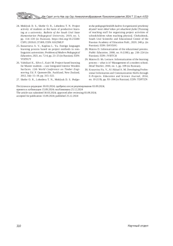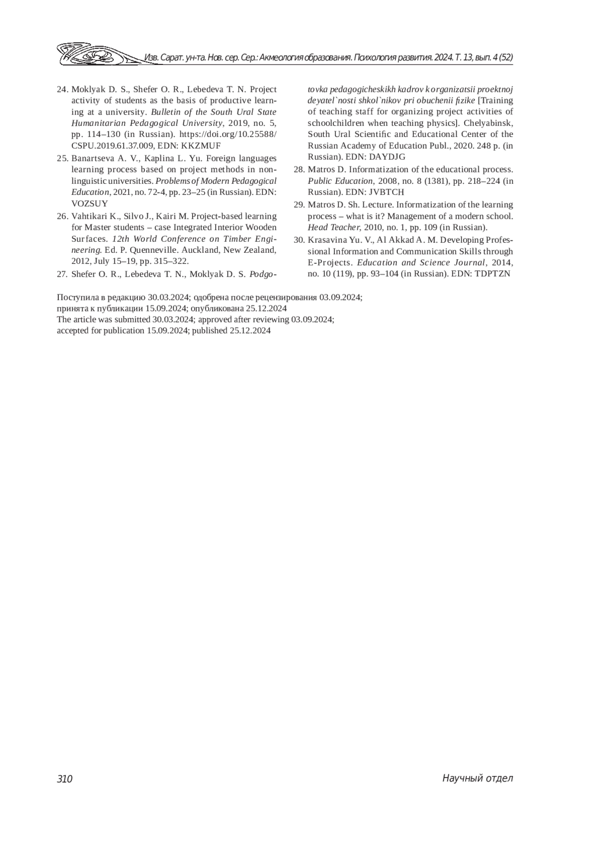 24. Мокляк Д. С., Шефер O. Р., Лебедева Т. Н. Проектная деятельность студентов как основа продуктивного обучения в вузe // Вестник Южно-Уральского государственного гуманитарно-педагогического университета. 2019. № 5. С. 114-130. 10.25588/ CSPU.2019.61.37.009,. DOI: 10.25588/CSPU.2019.61.37.009 EDN: KKZMUF