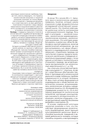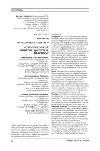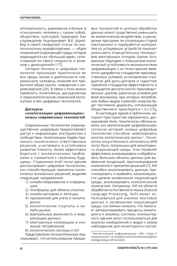 Результаты. В публичном интернет-пространстве оформилось дискурсивное поле, которое можно тематически обозначить как «экологизация цифровизации», согласно которому новейшие диджитал технологии способны предупреждать и решать некоторые экологические проблемы. Кроме того, можно утверждать, что термины «экологическое сознание» и «экология сознания» означают не только бережное отношение к природным ресурсам, но и ответственность за свои действия и позитивное отношение к миру в форме проактивного мышления (вместо реактивного), основанного на мировоззренческих установках экогуманизма и холизма.