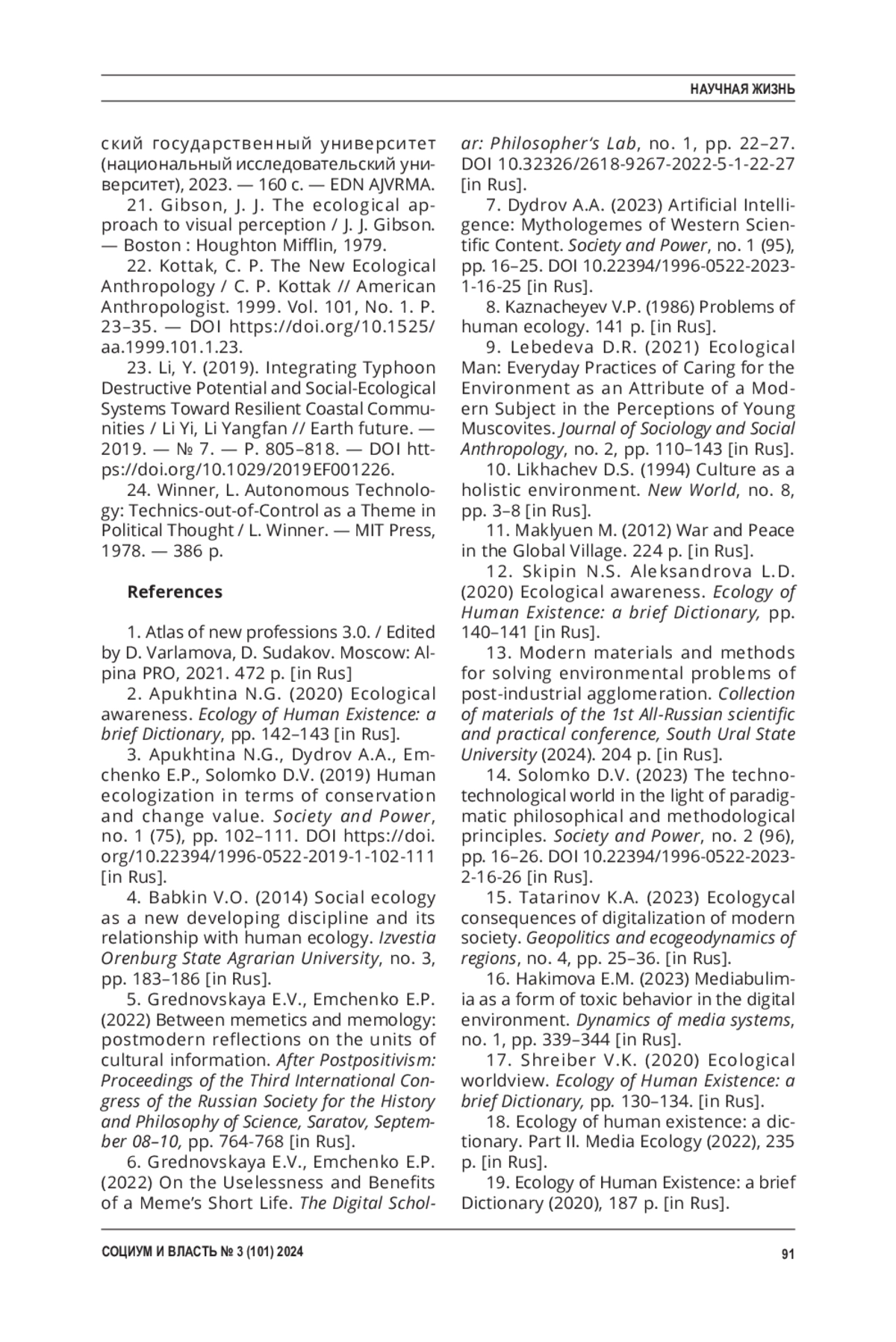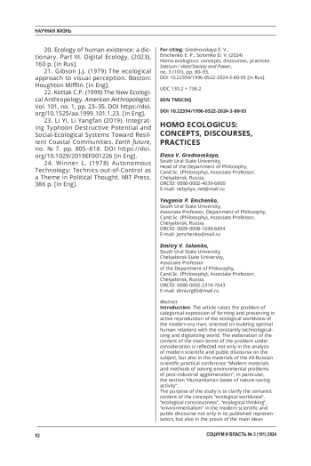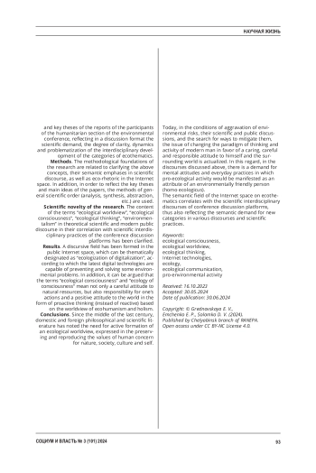 Выводы. С середины прошлого столетия в отечественной и зарубежной философской и научной литературе отмечается необходимость активного формирования экологического мировоззрения, выраженного в сохранении и воспроизводстве ценностей заботы человека о природе, обществе, культуре и самом себе. Сегодня в условиях обострения экологических рисков, их научных и публичных обсуждений, поисков способов нивелирования таковых актуализируется вопрос изменения парадигмы мышления и деятельности современного человека в пользу заботливого, бережного и ответственного отношения к себе и окружающему миру. В этой связи в рассмотренных дискурсах наблюдается востребованность ментальных установок и повседневных практик, в которых проэкологическая активность проявлялась бы в качестве атрибутивного свойства человека экологичного (homo ecologicus). Смысловое поле интернет-пространства по экотематике коррелирует с научными междисциплинарными дискурсами дискуссионных площадок конференций, также отражая тем самым семантическую востребованность новых категорий в разнообразных дискурсах и научных практиках.