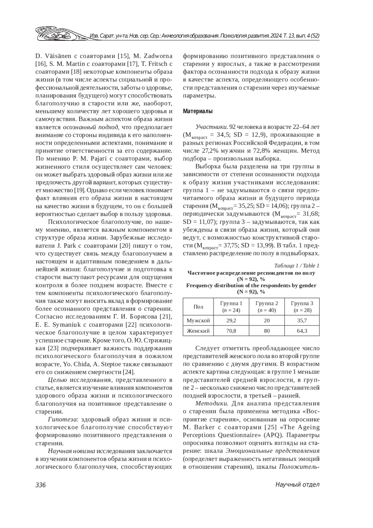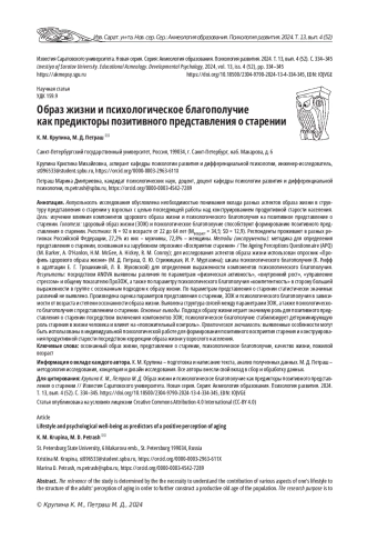 Цель: изучение влияния компонентов здорового образа жизни и психологического благополучия на позитивное представление о старении. Гипотеза: здоровый образ жизни (ЗОЖ) и психологическое благополучие способствуют формированию позитивного представления о старении. Участники: N = 92 в возрасте от 22 до 64 лет (Mвозраст = 34,5; SD = 12,9). Респонденты проживают в разных регионах Российской Федерации, 27,2% из них – мужчины, 72,8% – женщины. Методы (инструменты): методика для определения представления о старении, основанная на зарубежном опроснике «Восприятие старения» / The Ageing Perceptions Questionnaire (APQ) (M. Barker, A. O’Hanlon, H. M. McGee, A. Hickey, R. M. Conroy); для исследования аспектов образа жизни использован опросник «Профиль здорового образа жизни» (М. Д. Петраш, О. Ю. Стрижицкая, И. Р. Муртазина); шкала психологического благополучия (К. Рифф в адаптации Е. Г. Трошихиной, Л. В. Жуковской) для определения выраженности компонентов психологического благополучия.