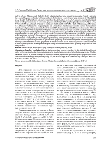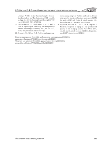 22. Symaniuk E. E., Borisov G. I., Sergeeva T. B., Pecherkina A. A., Obvintseva O. V. Psychological Well-being by Late Adulthood People // Lurian Journal. 2021. Vol. 2, iss. 3. P. 17-30. ,. DOI: 10.15826/Lurian.2021.2.3.3 EDN: XGLQSP