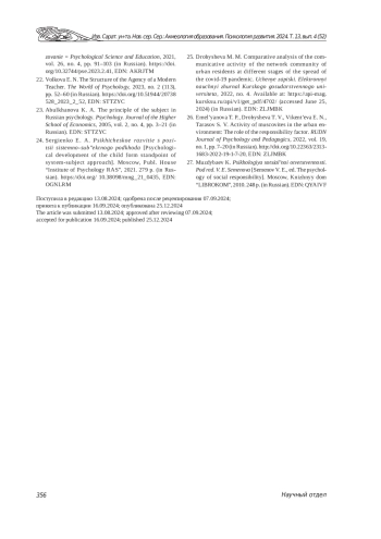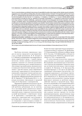 26. Емельянова Т. П., Дробышева Т. В., Викентьева Е. Н., Тарасов С. В. Активность москвичей в городской среде: роль фактора ответственности // Вестник Российского университета дружбы народов. Серия: Психология и педагогика. 2022. Т. 19, № 1. С. 7-20. ,. DOI: 10.22363/2313-1683-2022-19-1-7-20 EDN: ZLJMBK