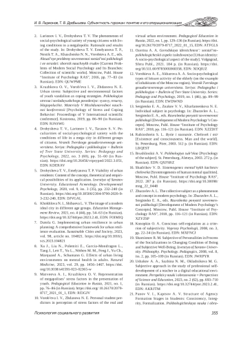 2. Ларионов И. В., Дробышева Т. В. Феномен социально-психологической пресыщенности молодых горожан условиями проживания в мегаполисе: обоснование и результаты исследования // Актуальные проблемы современной социальной психологии и ее отраслей: сборник научных трудов / под ред. Т. В. Дробышевой, Т. П. Емельяновой, Т. А. Нестик, Н. Н. Хащенко, А. Е. Воробьевой. М.: Изд-во “Институт психологии РАН”, 2023. С. 77-83. EDN: QUWPME