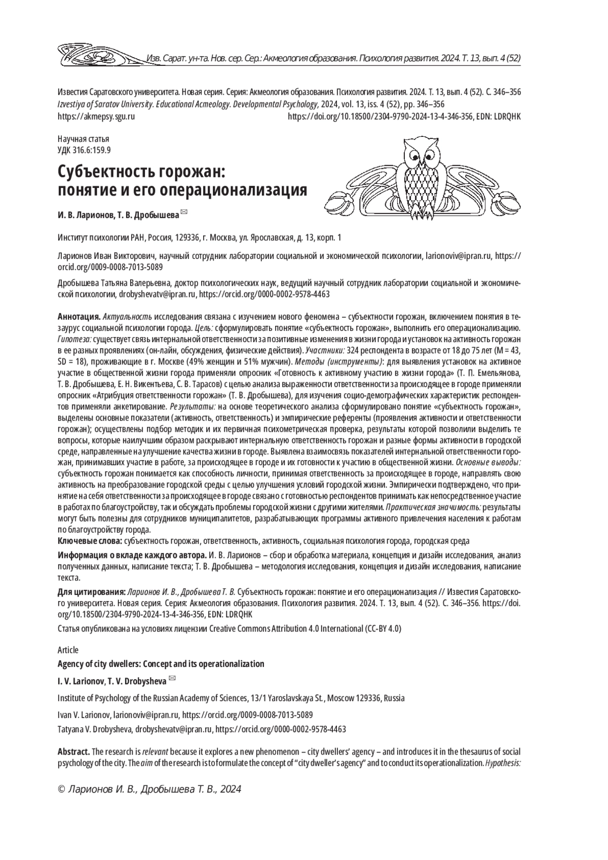 Цель: сформулировать понятие «субъектность горожан», выполнить его операционализацию. Гипотеза: существует связь интернальной ответственности за позитивные изменения в жизни города и установок на активность горожан в ее разных проявлениях (онлайн, обсуждения, физические действия). Участники: 324 респондента в возрасте от 18 до 75 лет (M = 43, SD = 18), проживающие в г. Москве (49% женщин и 51% мужчин). Методы (инструменты): для выявления установок на активное участие в общественной жизни города применяли опросник «Готовность к активному участию в жизни города» (Т. П. Емельянова, Т. В. Дробышева, Е. Н. Викентьева, С. В. Тарасов) с целью анализа выраженности ответственности за происходящее в городе применяли опросник «Атрибуция ответственности горожан» (Т. В. Дробышева), для изучения социо-демографических характеристик респондентов применяли анкетирование.